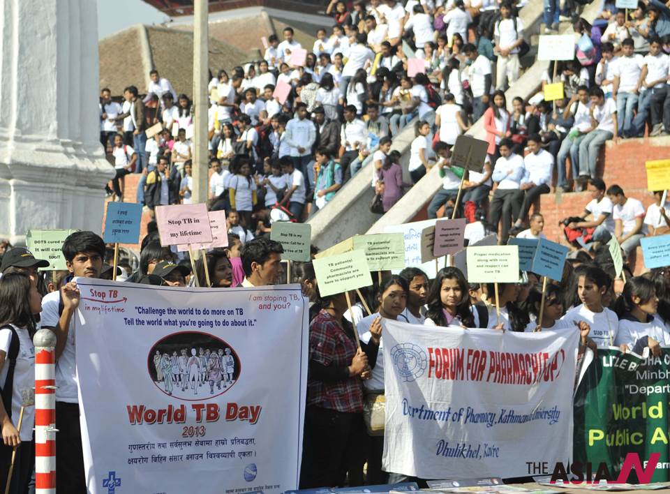 Nepalese students participate in a program marking the World TB (tuberculosis) Day in Kathmandu, Nepal, March 24, 2013. According to the National Tuberculosis Center (NTC) Nepal, around 40,000 people catch TB and 5,000-7,000 people die of it each year. NTC estimates that about 45 percent of Nepal’s total population is infected with TB. <Xinhua/NEWSis/Sunil Pradhan>