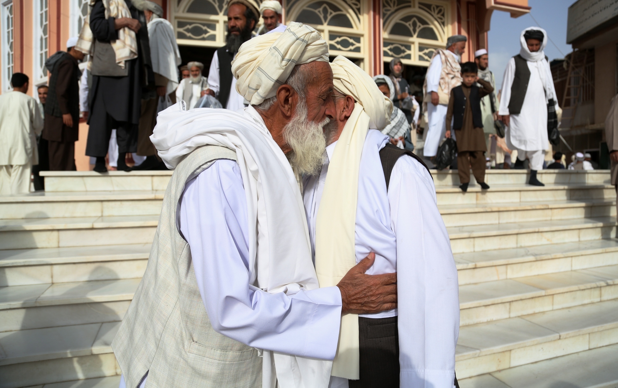 (160912) — GHAZNI, Sept. 12, 2016 (Xinhua) — Afghan men embrace each other after Eid al-Adha prayers at a mosque in Ghazni province, eastern Afghanistan, Sept. 12, 2016. Muslims across the world celebrate the Eid al-Adha festival, or the Festival of Sacrifice. (Xinhua/Rahmat Alizadah) (wtc)
