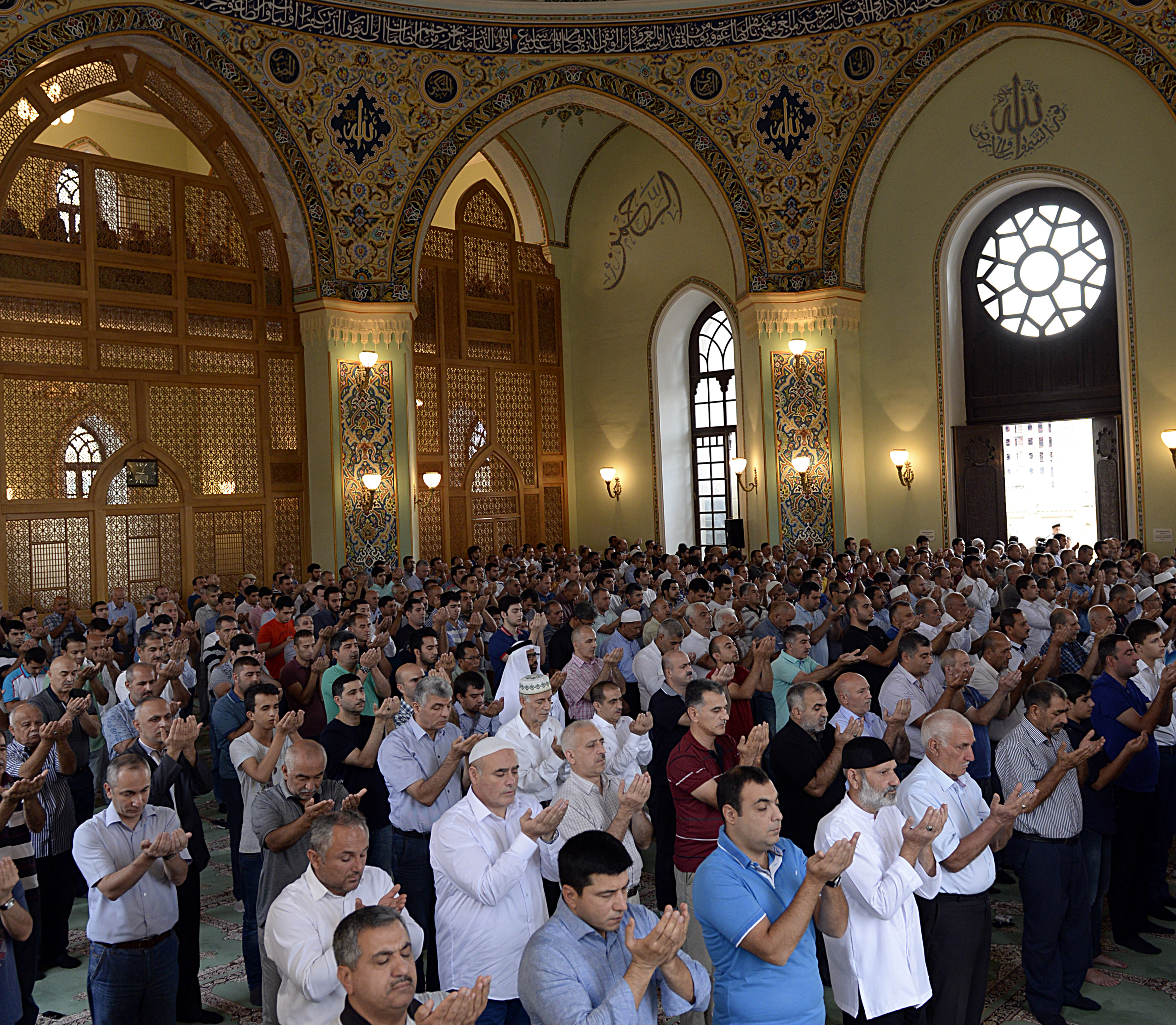 (160912) — BAKU, Sept. 12, 2016 (Xinhua) — People pray at a mosque in Baku, Azerbaijan, on Sept. 12, 2016. Muslims across the world celebrate the Eid al-Adha festival, or the Festival of Sacrifice. (Xinhua/Tofik Babayev)