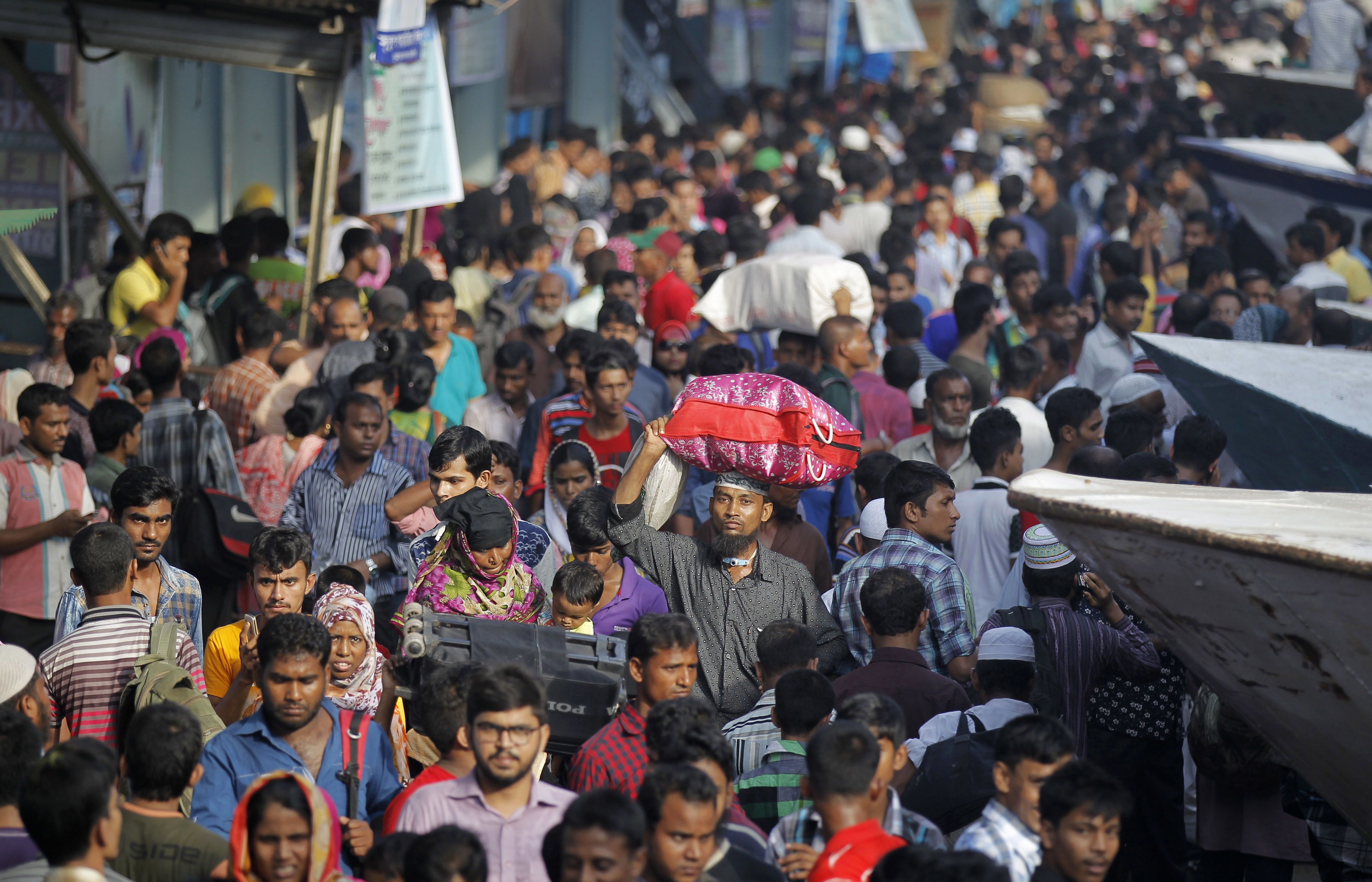 Bangladeshi Muslims crowd a ferry terminal as they prepare to travel to their hometowns for Eid al-Adha festival in Dhaka, Bangladesh, Friday, Sept. 9, 2016. Muslims around the world celebrate Eid al-Adha, or the Feast of the Sacrifice, to commemorate the prophet Ibrahim’s faith in being willing to sacrifice his son. (AP Photo/A.M. Ahad)