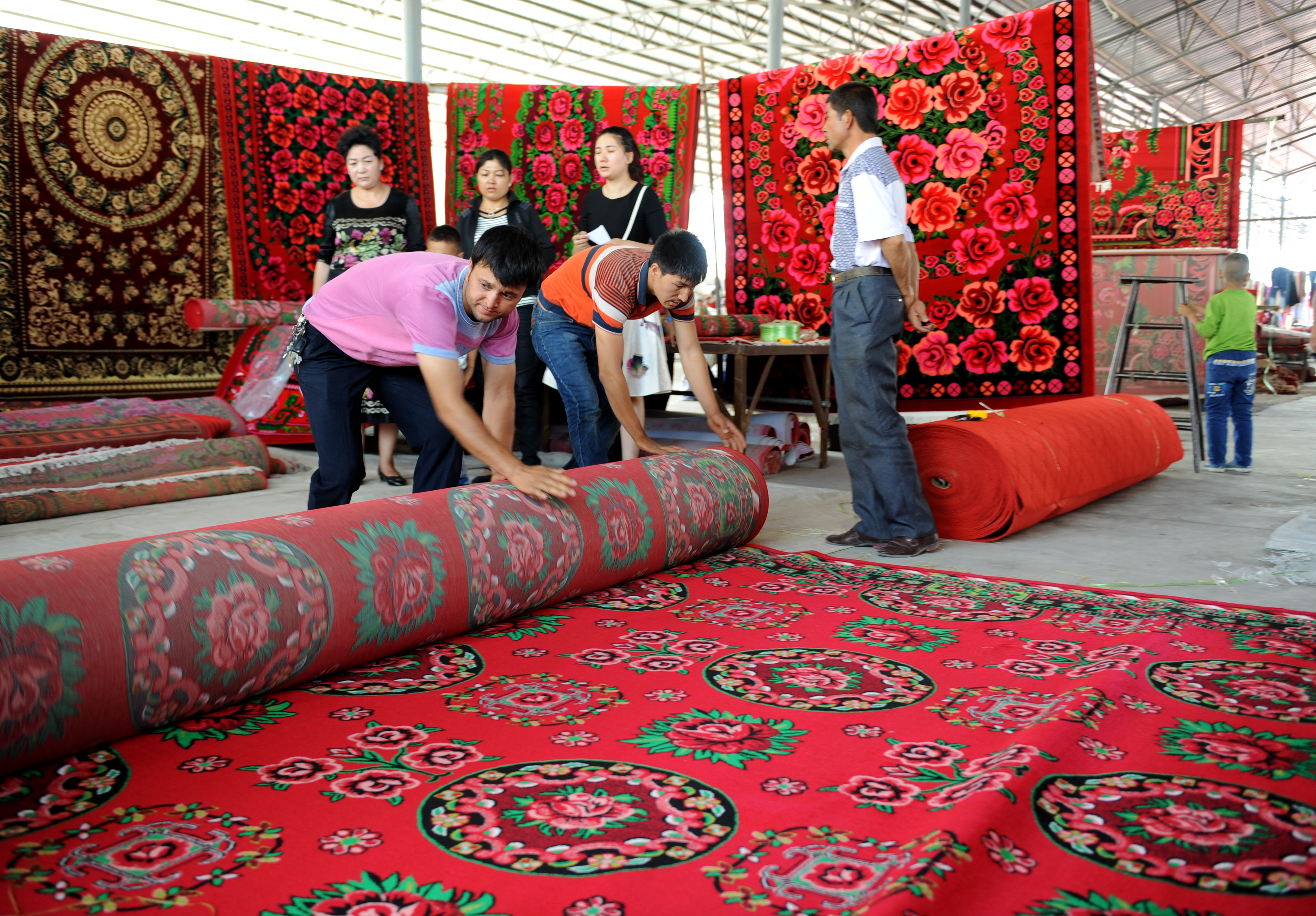(160911) — AKSU, Sept. 11, 2016 (Xinhua) — Sellers pack a carpet for customers at a bazaar in Aksu, northwest China’s Xinjiang Uygur Autonomous Region, Sept. 11, 2016. Local Muslims prepared for the upcoming Corban Festival, also known as Eid al-Adha or the feast of the sacrifice, in various ways. (Xinhua/Wei Hai) (wf)