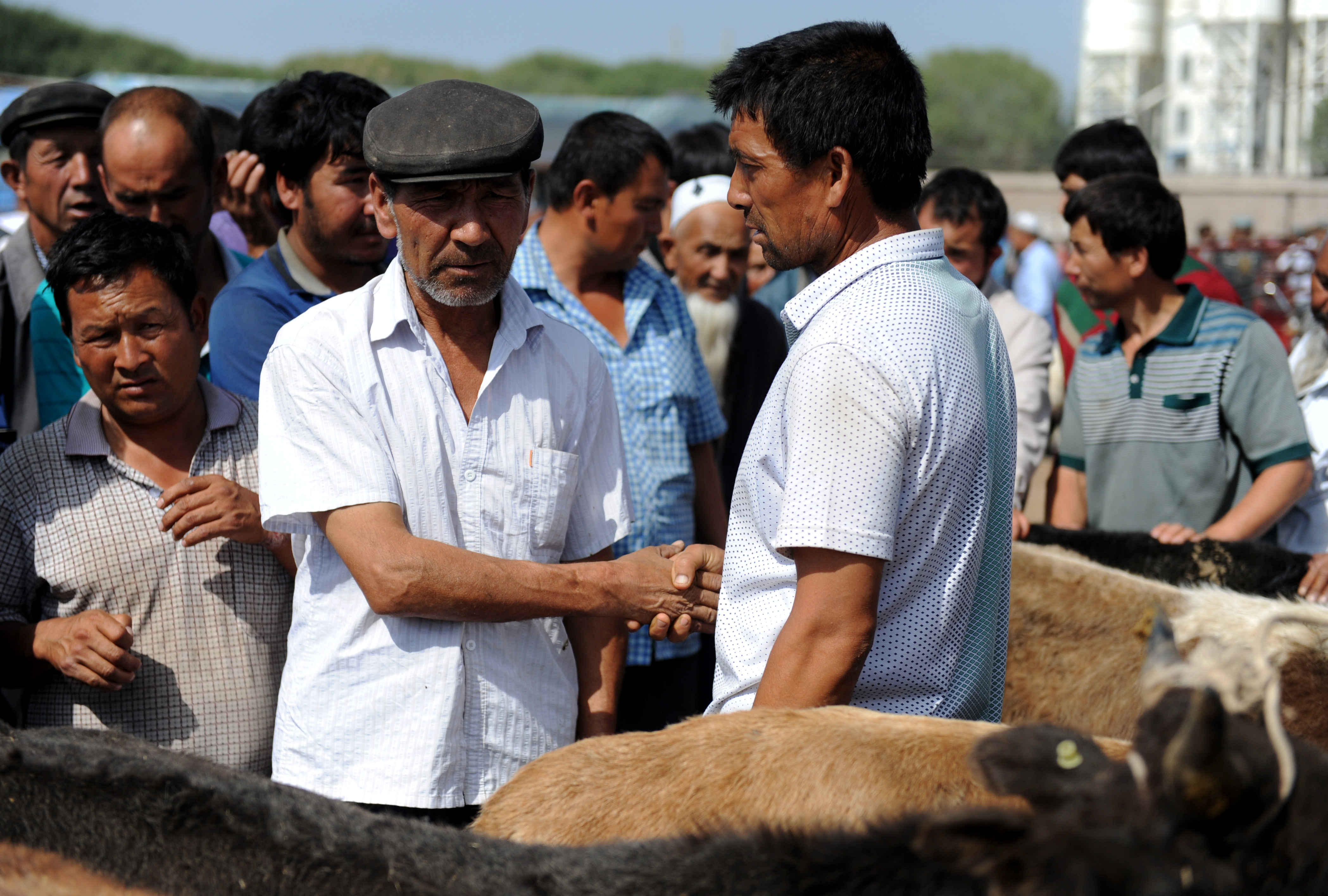 (160911) — AKSU, Sept. 11, 2016 (Xinhua) — A customer (L, front) bargains with a seller in a specific way at a livestock bazaar in Aksu, northwest China’s Xinjiang Uygur Autonomous Region, Sept. 11, 2016. Local Muslims prepared for the upcoming Corban Festival, also known as Eid al-Adha or the feast of the sacrifice, in various ways. (Xinhua/Wei Hai) (wf)