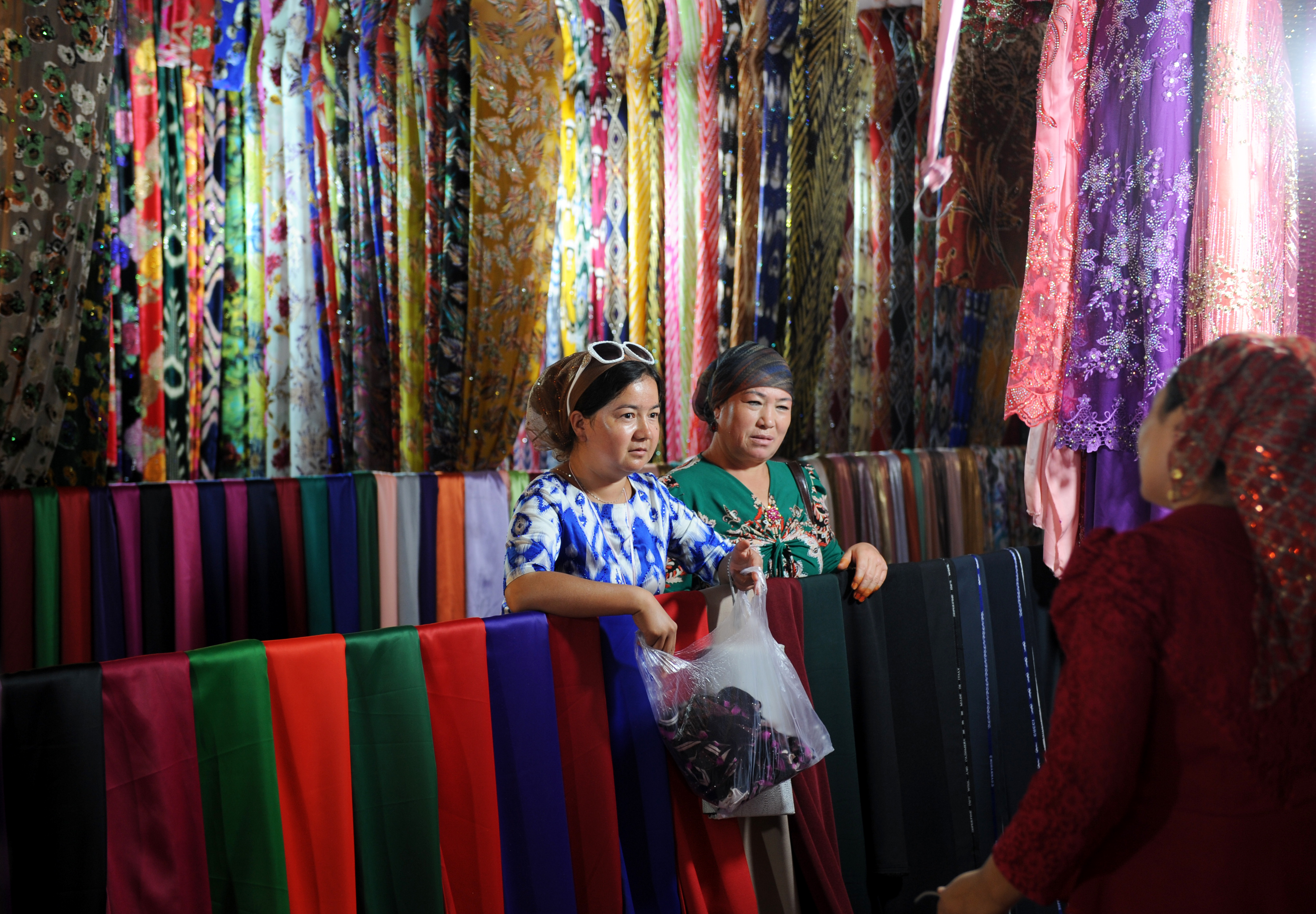 (160911) — AKSU, Sept. 11, 2016 (Xinhua) — Women shop at a fabric store in Aksu, northwest China’s Xinjiang Uygur Autonomous Region, Sept. 11, 2016. Local Muslims prepared for the upcoming Corban Festival, also known as Eid al-Adha or the feast of the sacrifice, in various ways. (Xinhua/Wei Hai) (wf)