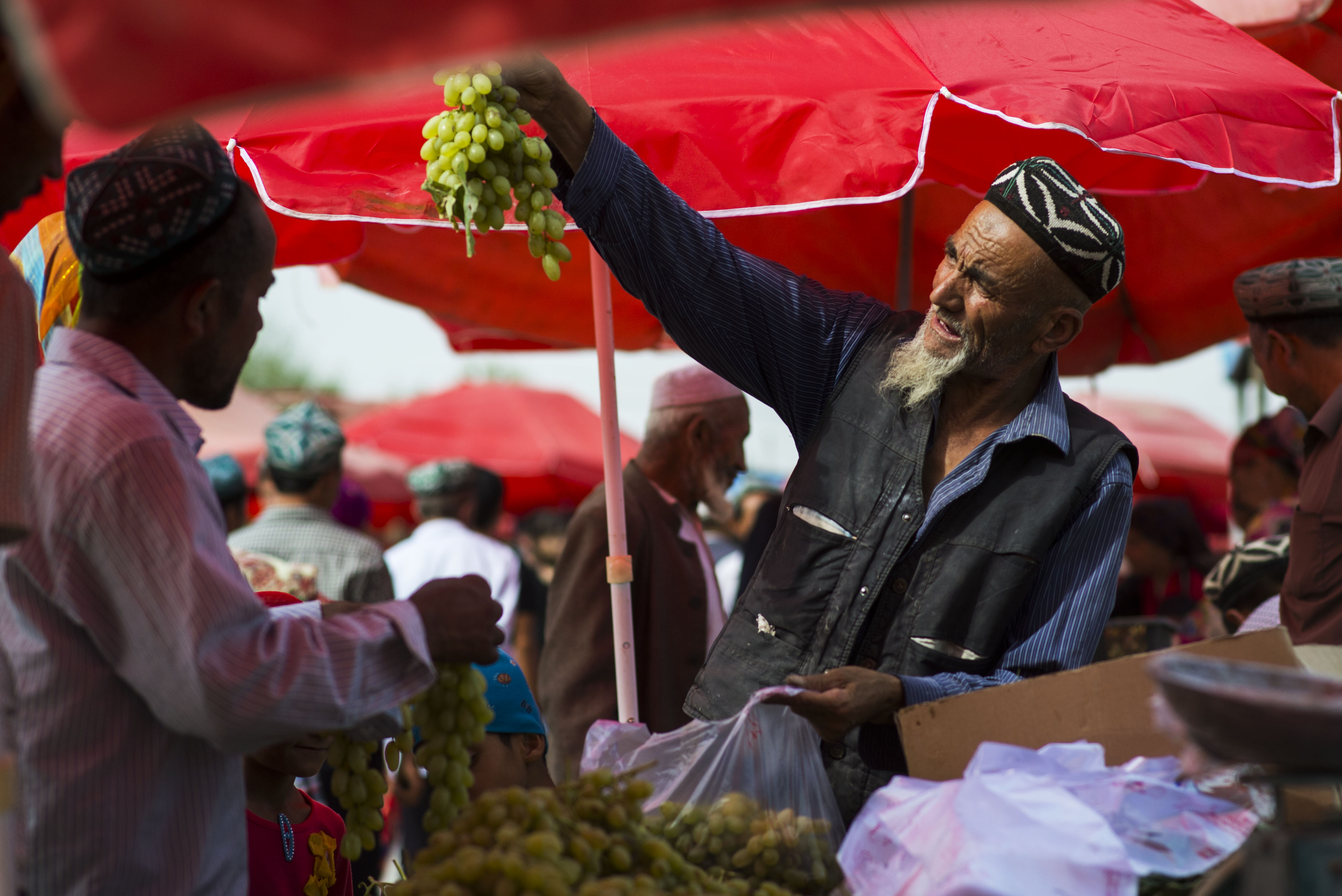 (160911) — QIRA, Sept. 11, 2016 (Xinhua) — A man sells his grapes at a bazaar in Qira County, northwest China’s Xinjiang Uygur Autonomous Region, Sept. 11, 2016. Local Muslims prepared for the upcoming Corban Festival, also known as Eid al-Adha or the feast of the sacrifice, in various ways. (Xinhua/Jiang Wenyao) (wyl)