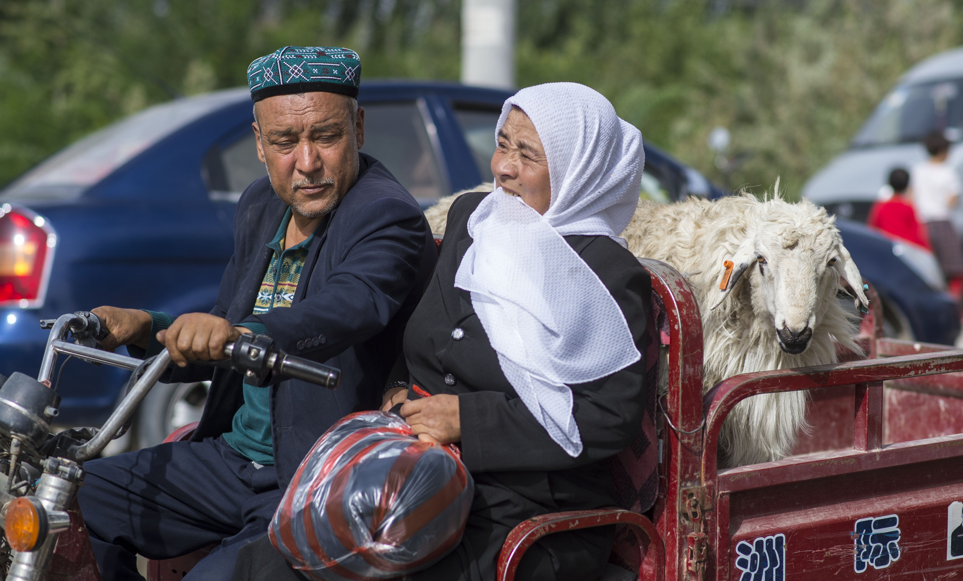 (160911) — QIRA, Sept. 11, 2016 (Xinhua) — A couple carry a sheep back home from a bazaar in Qira County, northwest China’s Xinjiang Uygur Autonomous Region, Sept. 11, 2016. Local Muslims prepared for the upcoming Corban Festival, also known as Eid al-Adha or the feast of the sacrifice, in various ways. (Xinhua/Jiang Wenyao) (wyl)