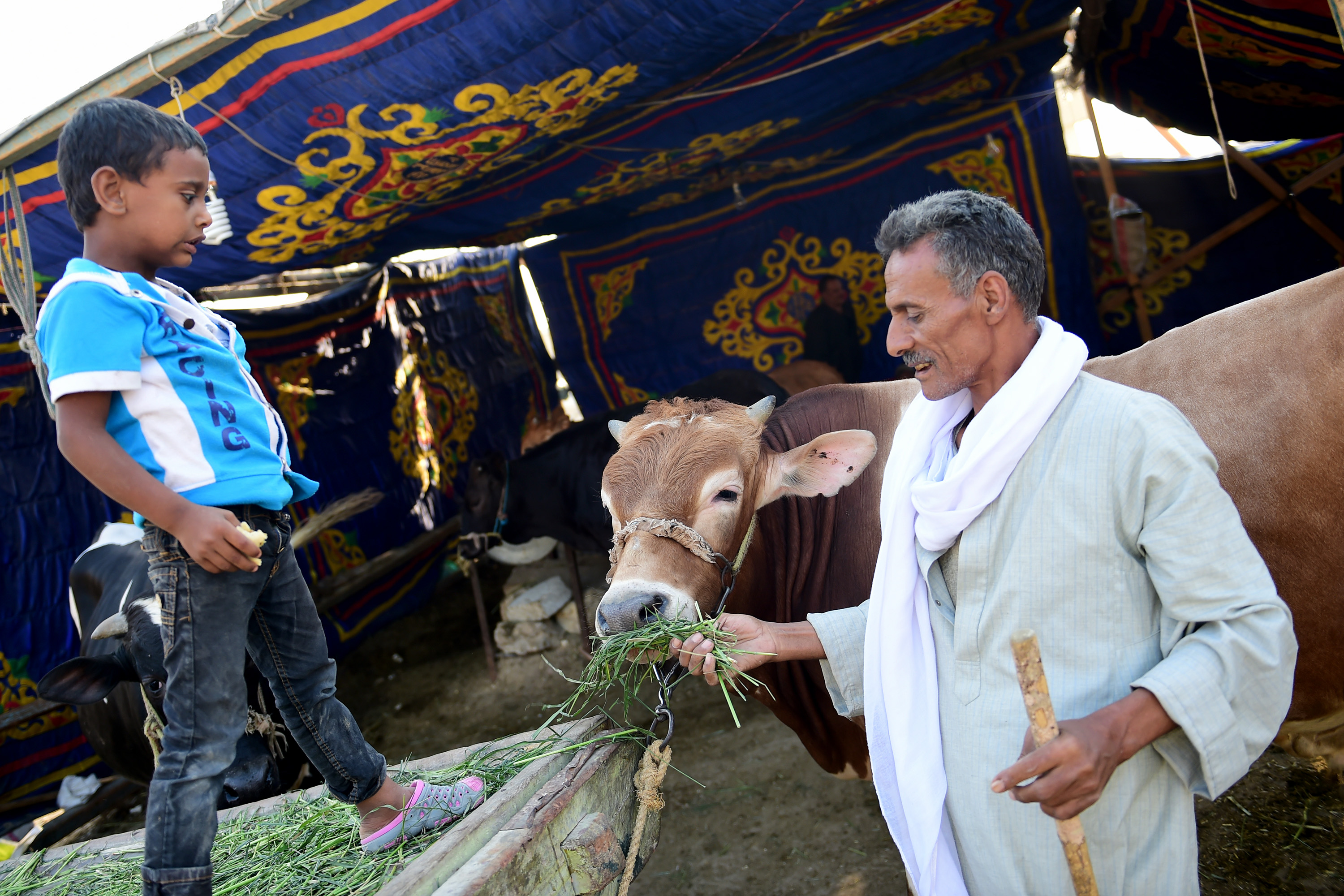 (160909) — CAIRO, Sept. 9, 2016 (Xinhua) — A vendor feeds his cattle at a cattle market ahead of the Muslim festival of sacrifice Eid al-Adha, in Cairo, Egypt on Sept. 8, 2016. (Xinhua/Zhao Dingzhe)(axy)