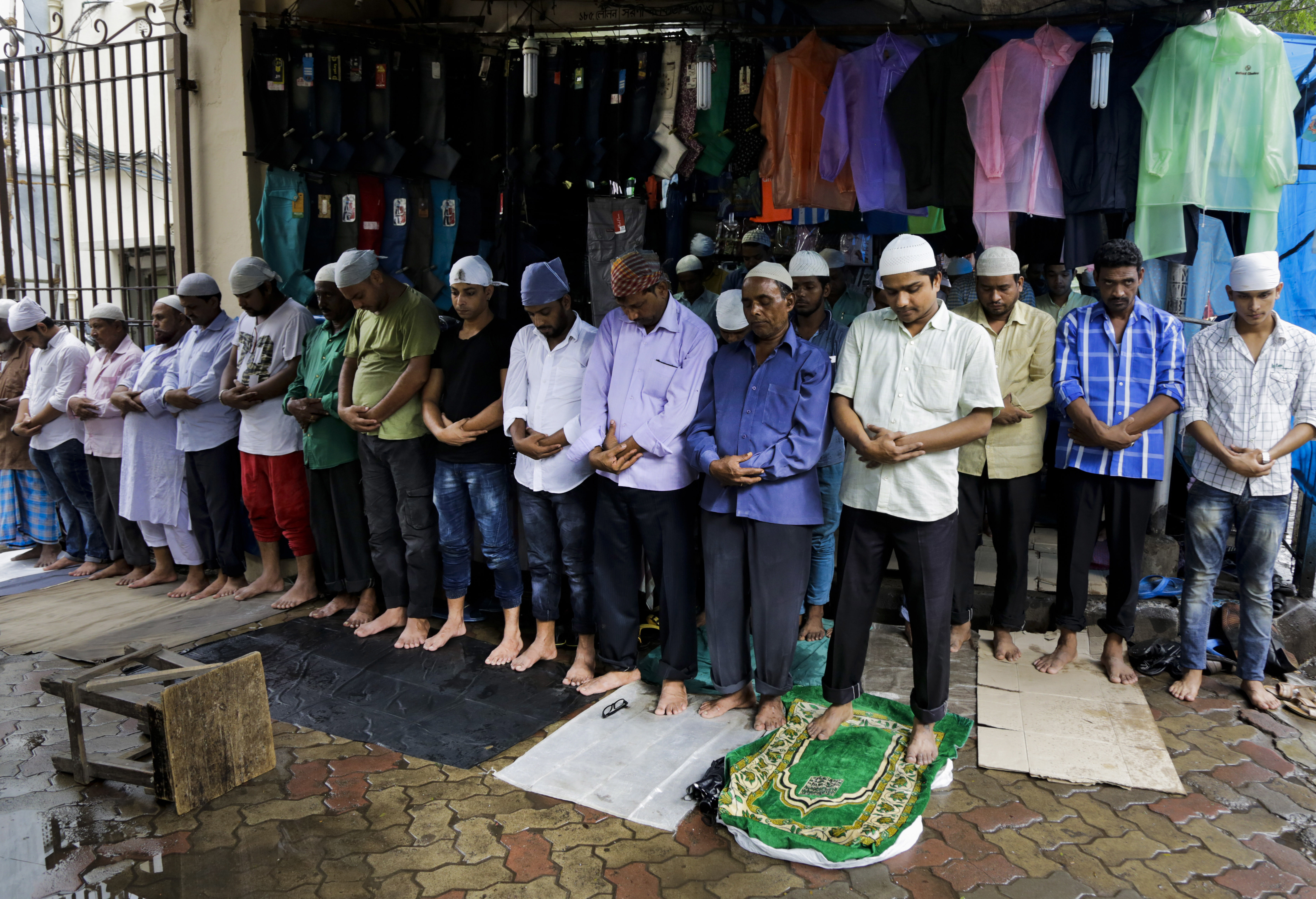 Muslims offer prayers on a pavement on the Friday ahead of Eid al-Adha in Kolkata, India, Friday, Sept. 9, 2016. Muslims around the world celebrate Eid al-Adha, or the Feast of the Sacrifice, by sacrificing animals to commemorate the prophet Ibrahim’s faith in being willing to sacrifice his son. (AP Photo/Bikas Das)