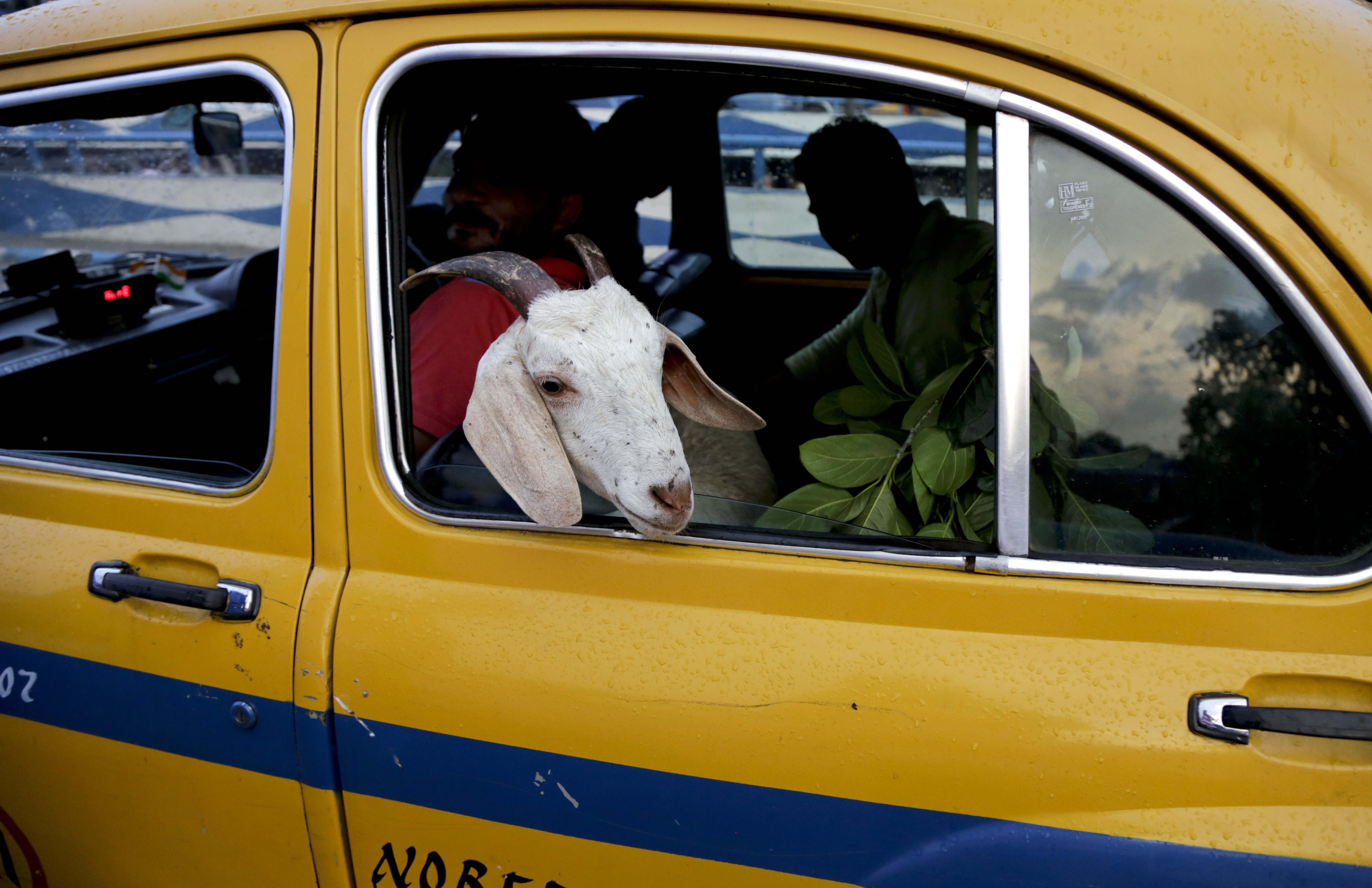 A goat is transported in a yellow cab near a live stock market ahead of the Muslim festival Eid al-Adha in Kolkata, India, Sunday, Sept. 11, 2016. Eid al-Adha, or the festival of sacrifice is celebrated by Muslims around the world to commemorate Prophet Ibrahim’s test of faith. During the Eid, Muslims slaughter livestock and distribute the meat to the poor. (AP Photo/Bikas Das)