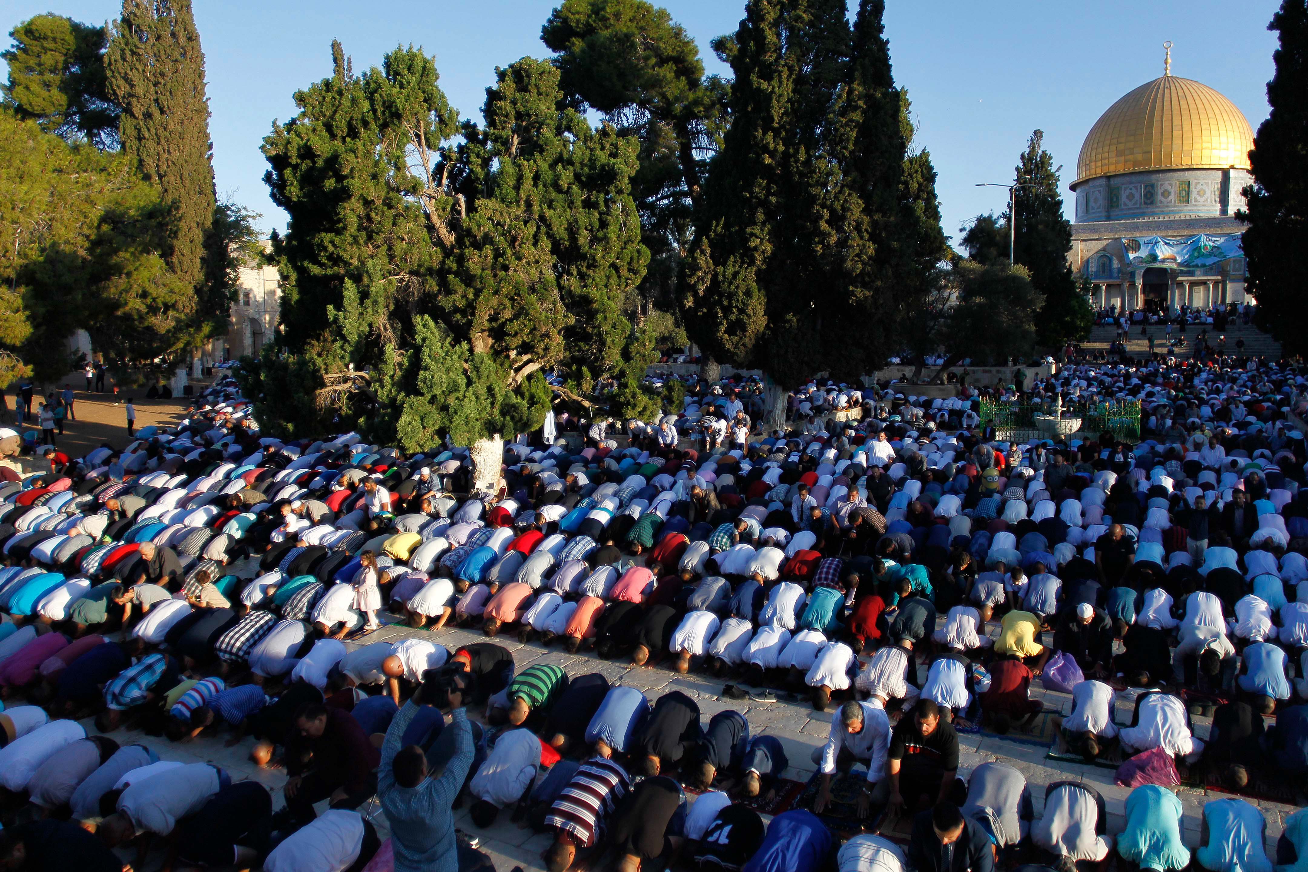 (160912) — JERUSALEM, Sept. 12, 2016(Xinhua) — Palestinians perform the morning prayer marking the Eid al-Adha festival outside the Dome of the Rock in Jerusalem’s Al-Aqsa mosque compound, Sept. 12, 2016. (Xinhua/Muammar Awad)