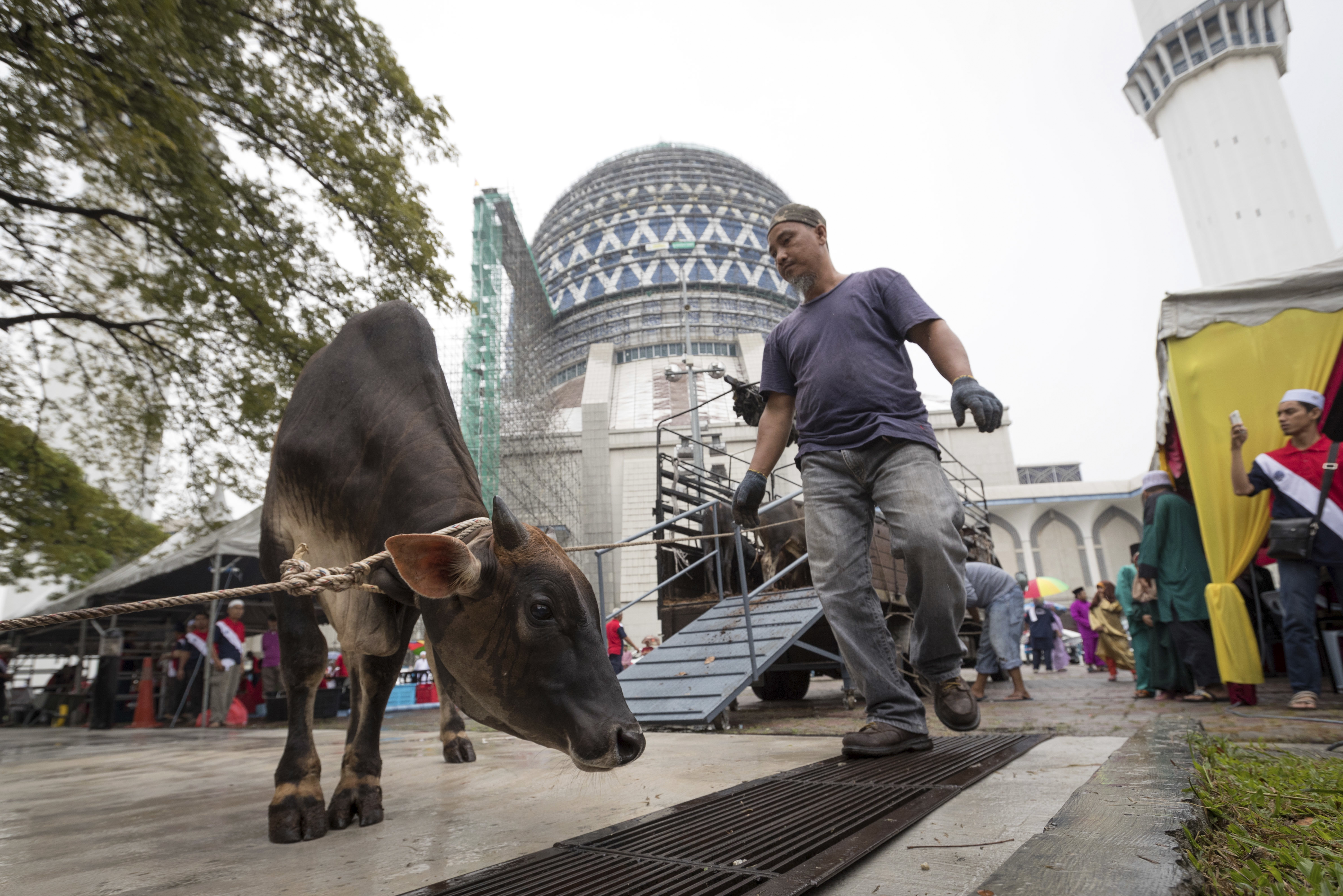 Malaysian Muslim men prepare to slaughter a cow for sacrifice during the Islamic holiday of Eid al-Adha at a mosque in Shah Alam, outskirts of Kuala Lumpur, Malaysia, Monday, Sept. 12, 2016. Eid al-Adha, or the festival of sacrifice, is celebrated by Muslims around the world to commemorate Prophet Ibrahim’s test of faith. (AP Photo/Vincent Thian)