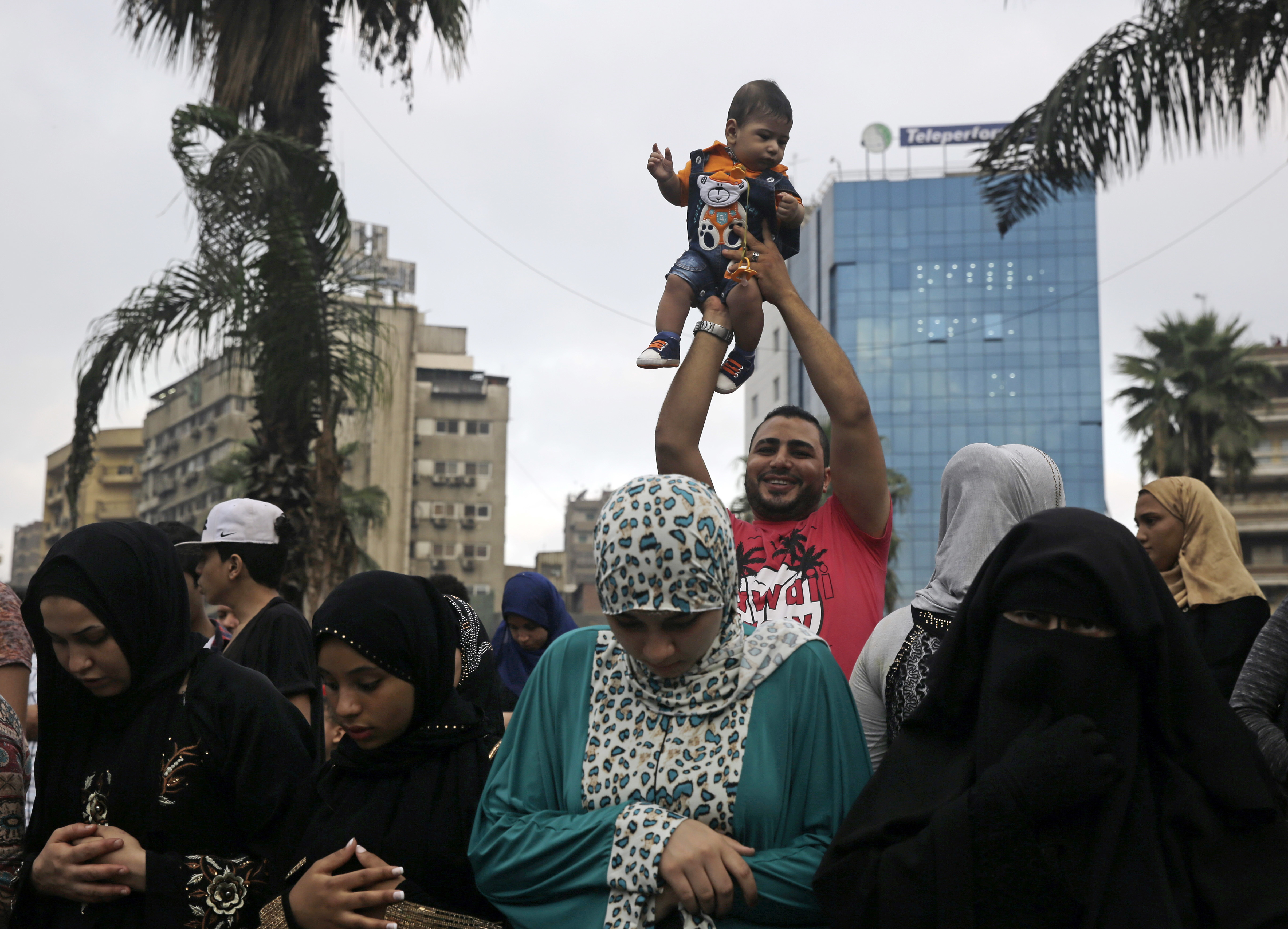 A man holds a child in the air as others pray the dawn Eid al-Adha prayers at Mustafa Mahmoud Square in Cairo, Egypt, Monday, Sept. 12, 2016. (AP Photo/Thomas Hartwell)