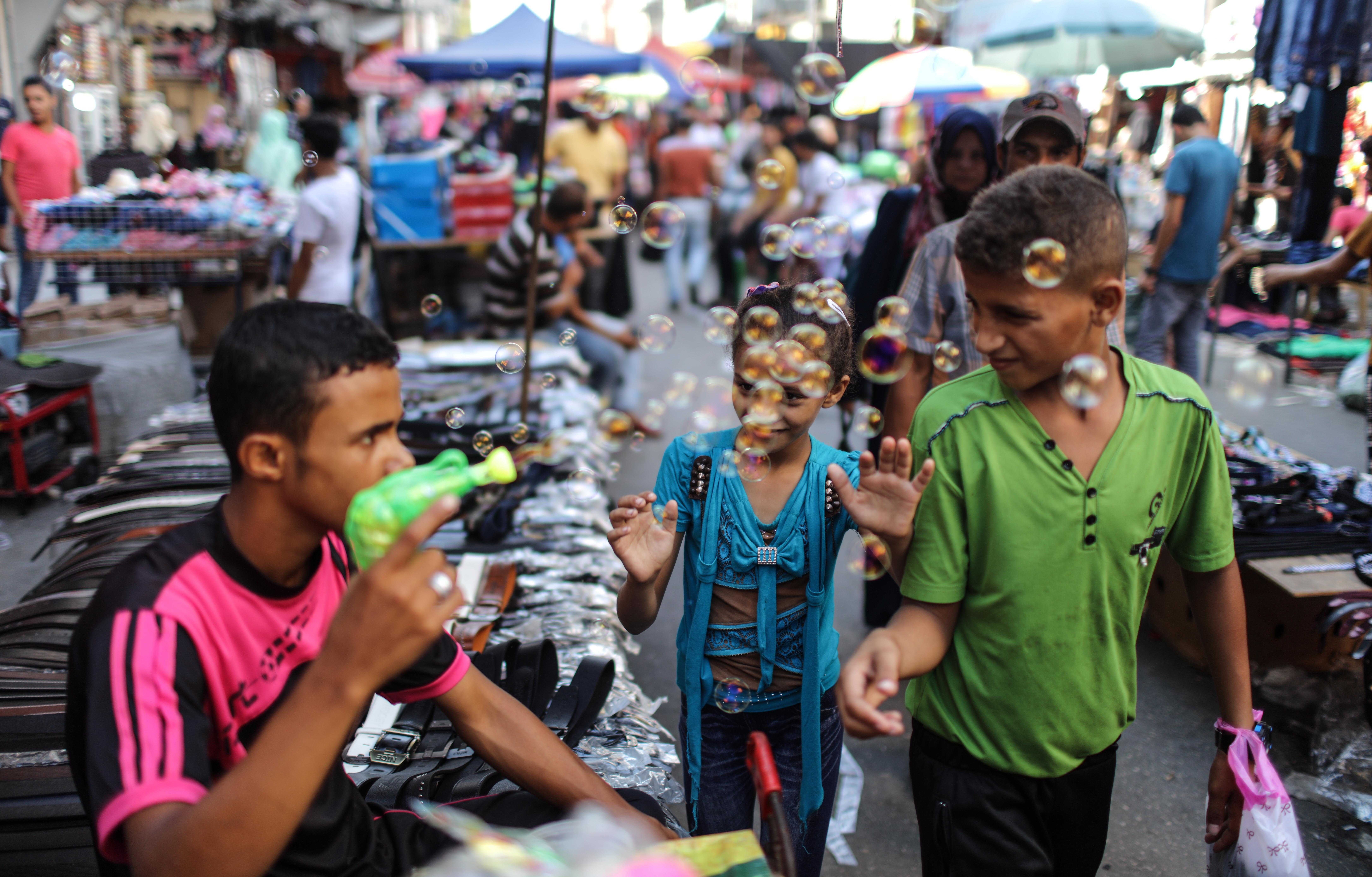 (160912) — GAZA, Sept. 12, 2016 (Xinhua) — Palestinians walk in a market ahead of the Muslim festival Eid al-Adha in Gaza City, Sept. 11, 2016. Muslims across the world are preparing to celebrate the annual festival of Eid al-Adha, or the Festival of Sacrifice. (Xinhua/Wissam Nassar) (zjy)