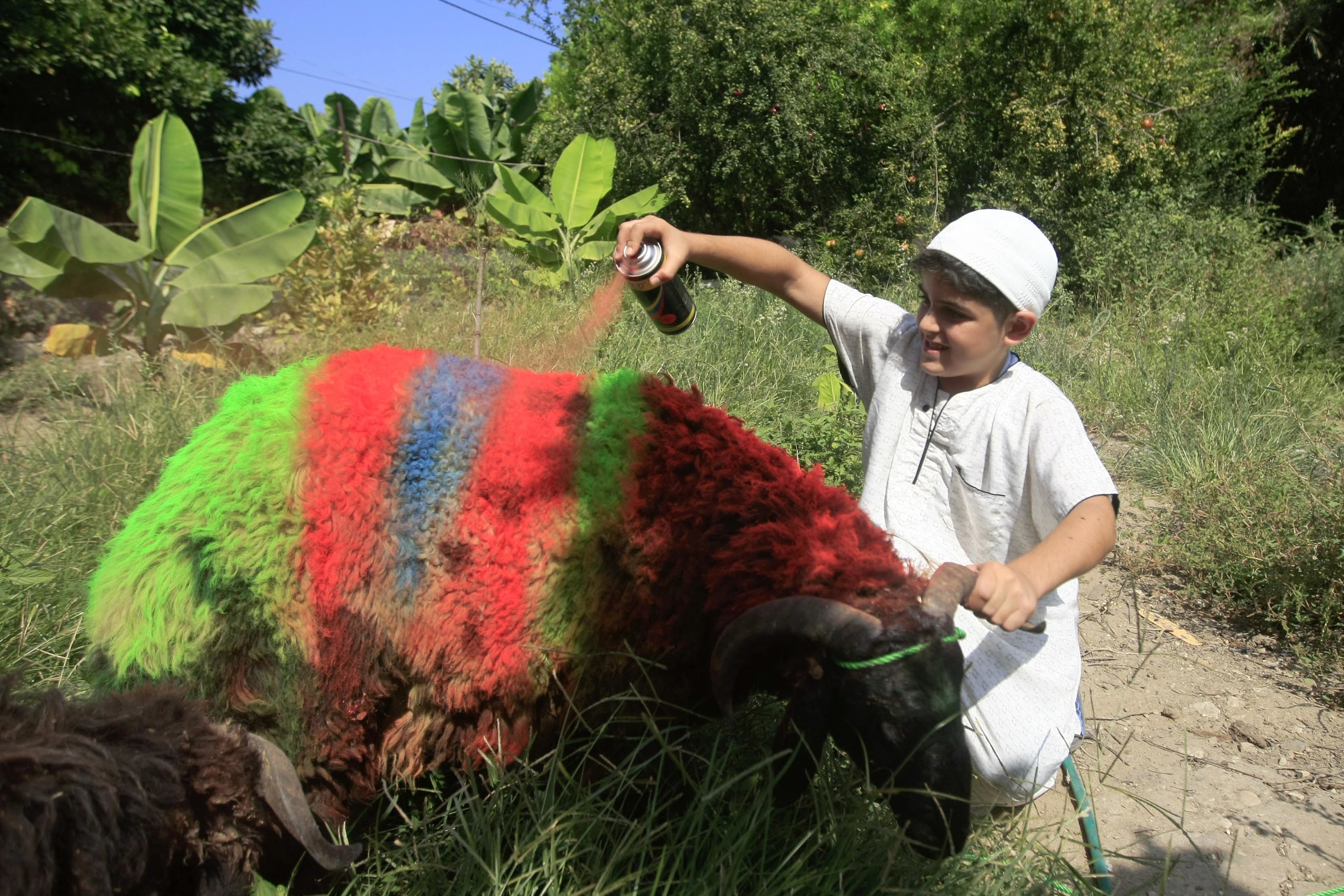 Rafik al Hibish, 11, colors a sheep ahead of the Muslim holiday of Eid al-Adha in in the southern port city of Sidon, Lebanon, Friday, Sept. 9, 2016. Eid al-Adha, or Feast of Sacrifice, commemorates what Muslims believe was Prophet Abraham’s willingness to sacrifice his son. (AP Photo/Mohammed Zaatari)