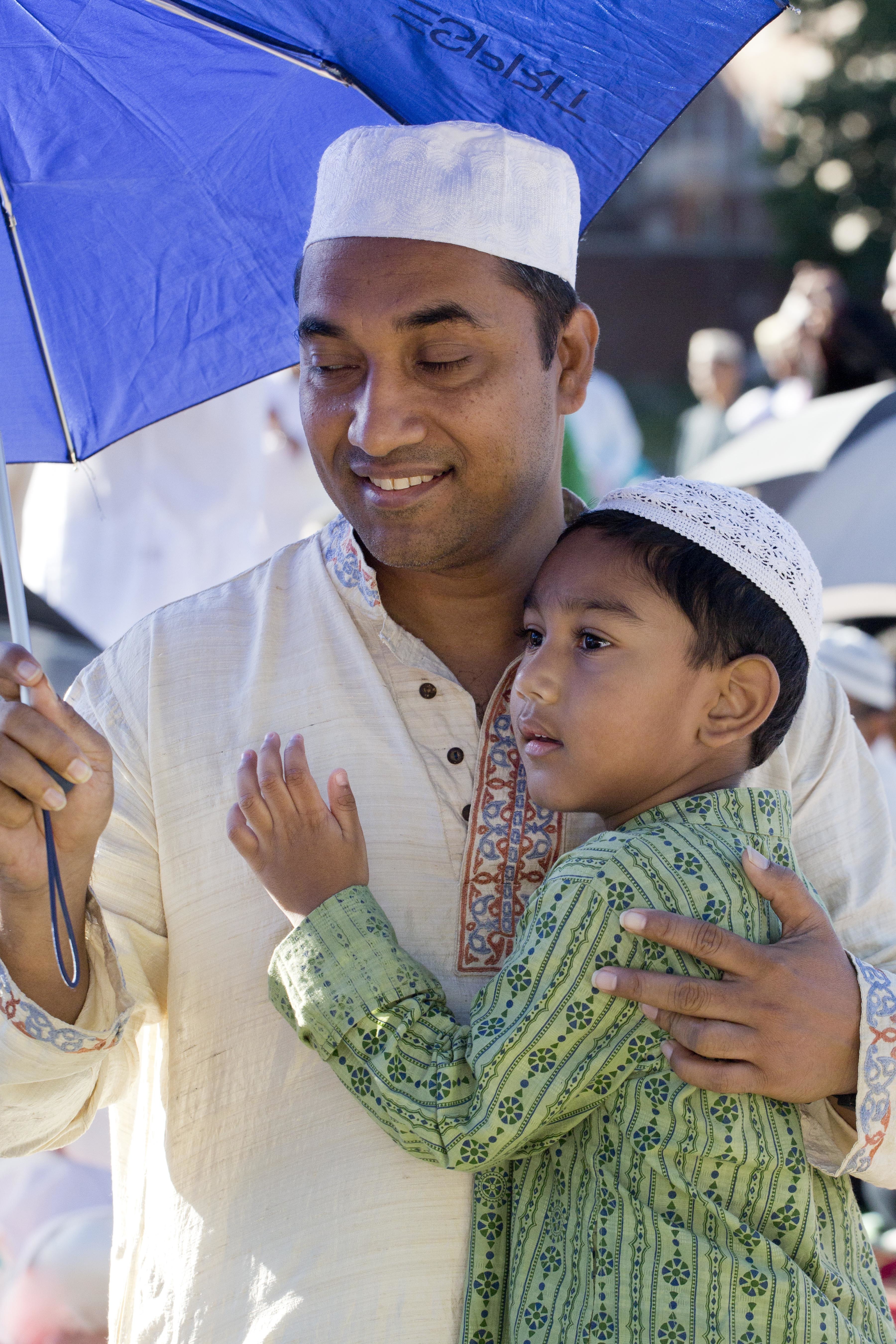A man holds his son, and an umbrella for shade, during a service for the Eid al-Adha holiday, Monday, Sept. 12, 2016, in the Queens borough of New York. (AP Photo/Mark Lennihan)