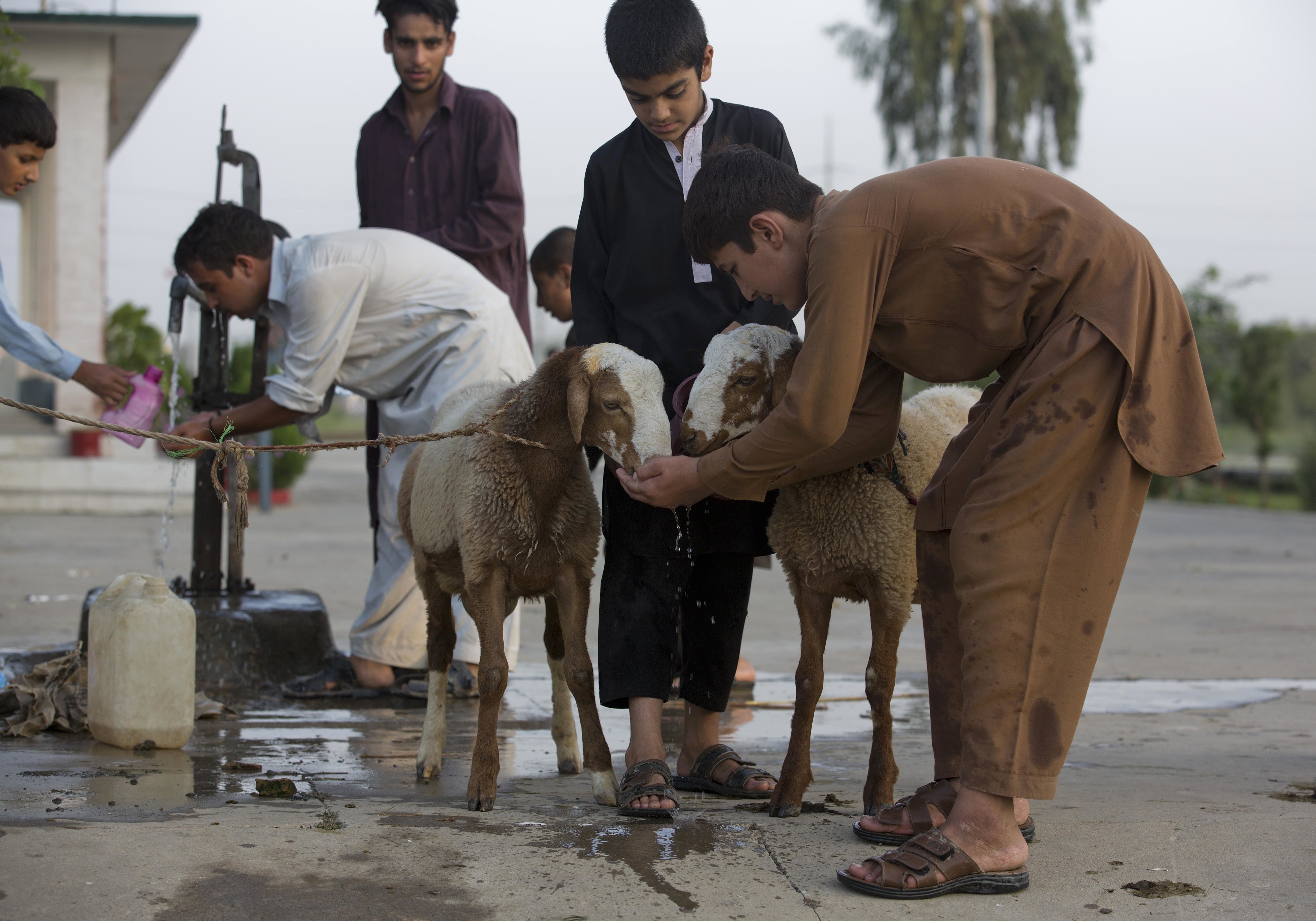 Pakistani boys water their sheep they bought for Eid al-Adha in Islamabad, Pakistan, Friday, Sept 9, 2016. Eid al-Adha, or the Feast of the Sacrifice, marks the willingness of the Prophet Ibrahim — Abraham to Christians and Jews — to sacrifice his son. During the holiday Muslims slaughter sheep and cattle, distribute part of the meat to the poor and eat the rest. (AP Photo/B.K. Bangash)