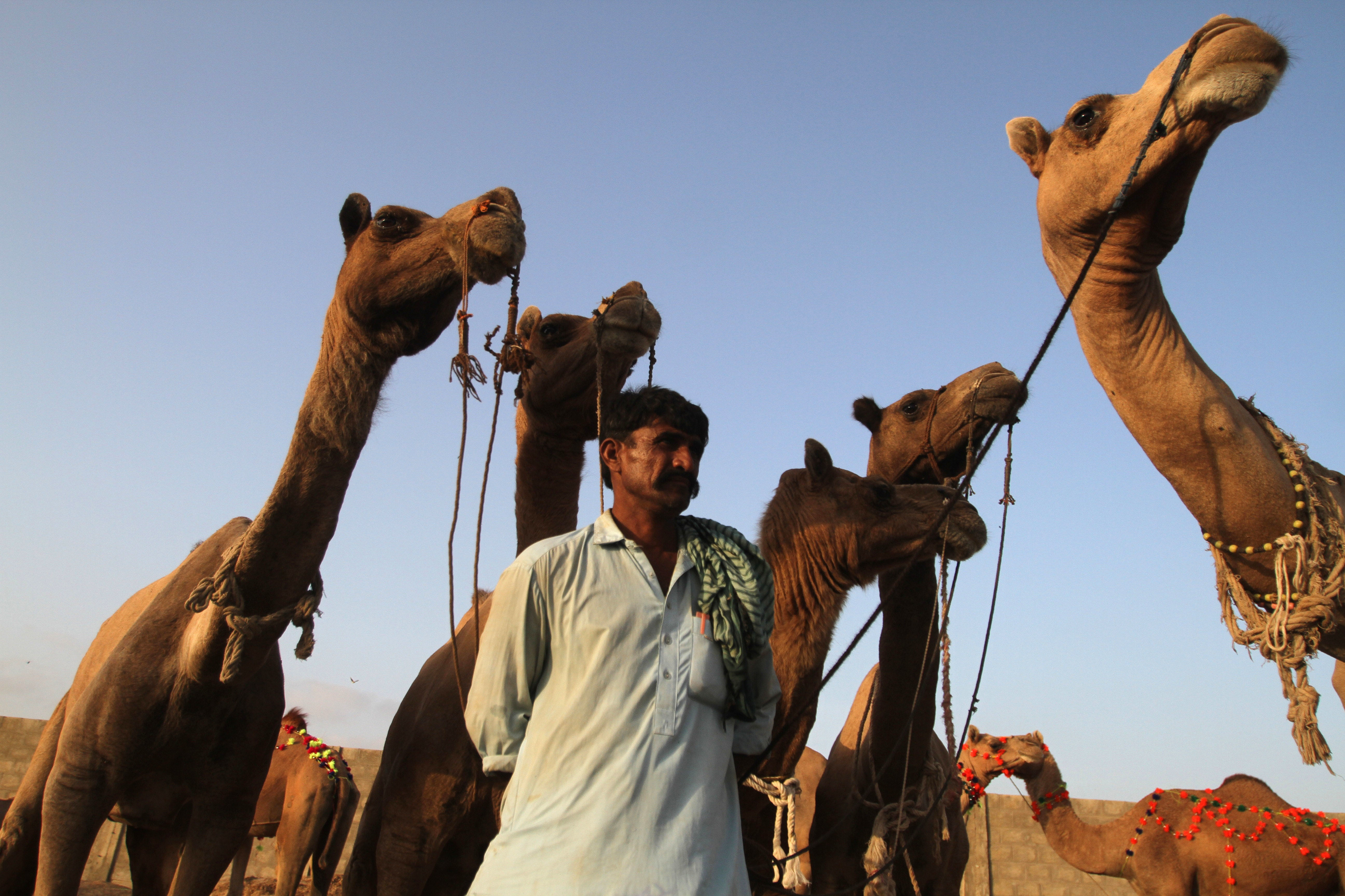 A Pakistani vendor wait for customers at a cattle market set up for the upcoming Muslim holiday of Eid al-Adha, in Karachi, Pakistan, Friday, Sept 9, 2016. Eid al-Adha, or the Feast of the Sacrifice, marks the willingness of the Prophet Ibrahim — Abraham to Christians and Jews — to sacrifice his son. During the holiday Muslims slaughter sheep and cattle, distribute part of the meat to the poor and eat the rest. (AP Photo/Fareed Khan)