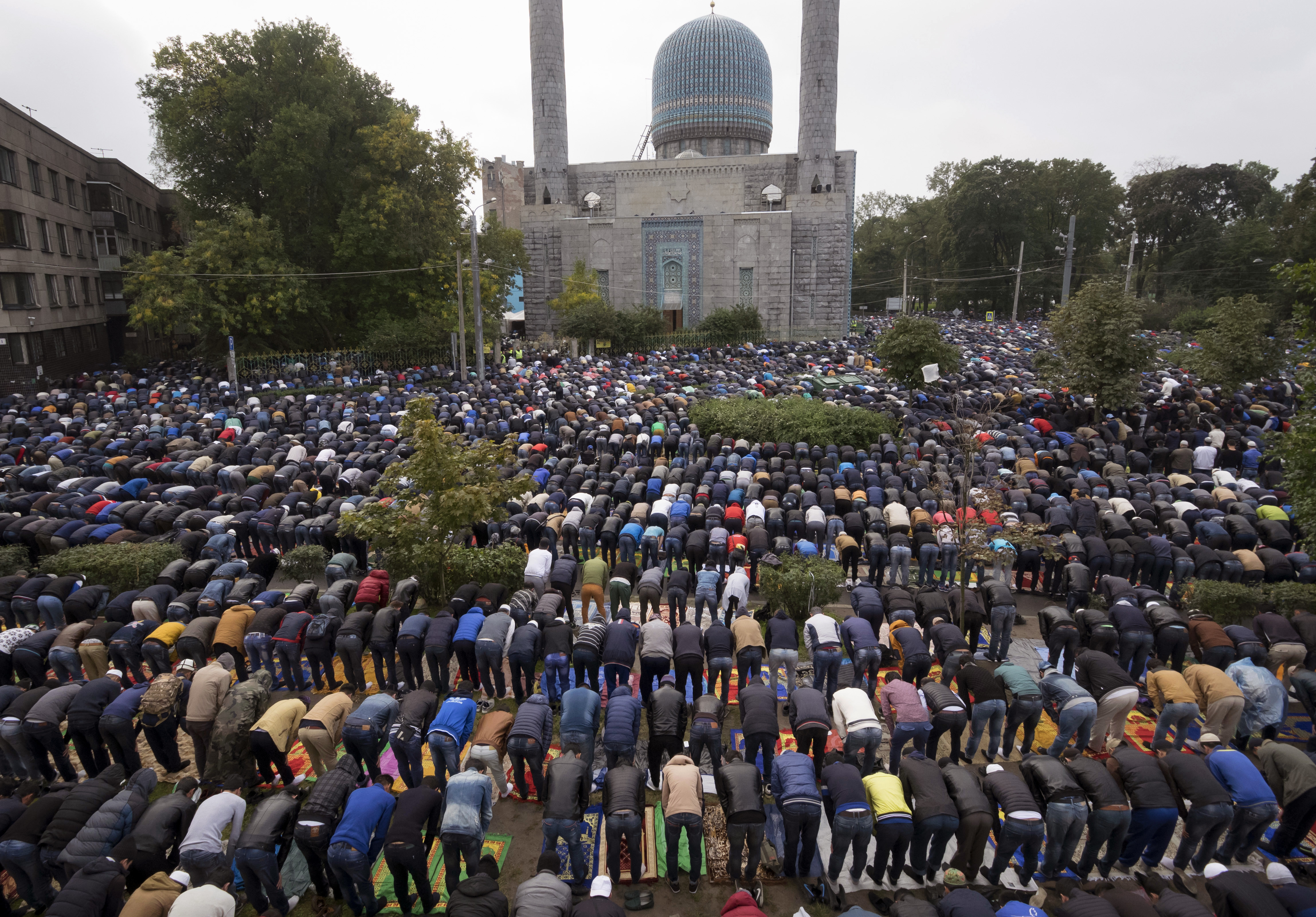 Russian Muslims pray outside a mosque in St. Petersburg, Russia, as they celebrate Eid al- Adha, which Muslims in Russia call Kurban-Bairam, on Monday, Sept. 12, 2016. (AP Photo/Dmitri Lovetsky)