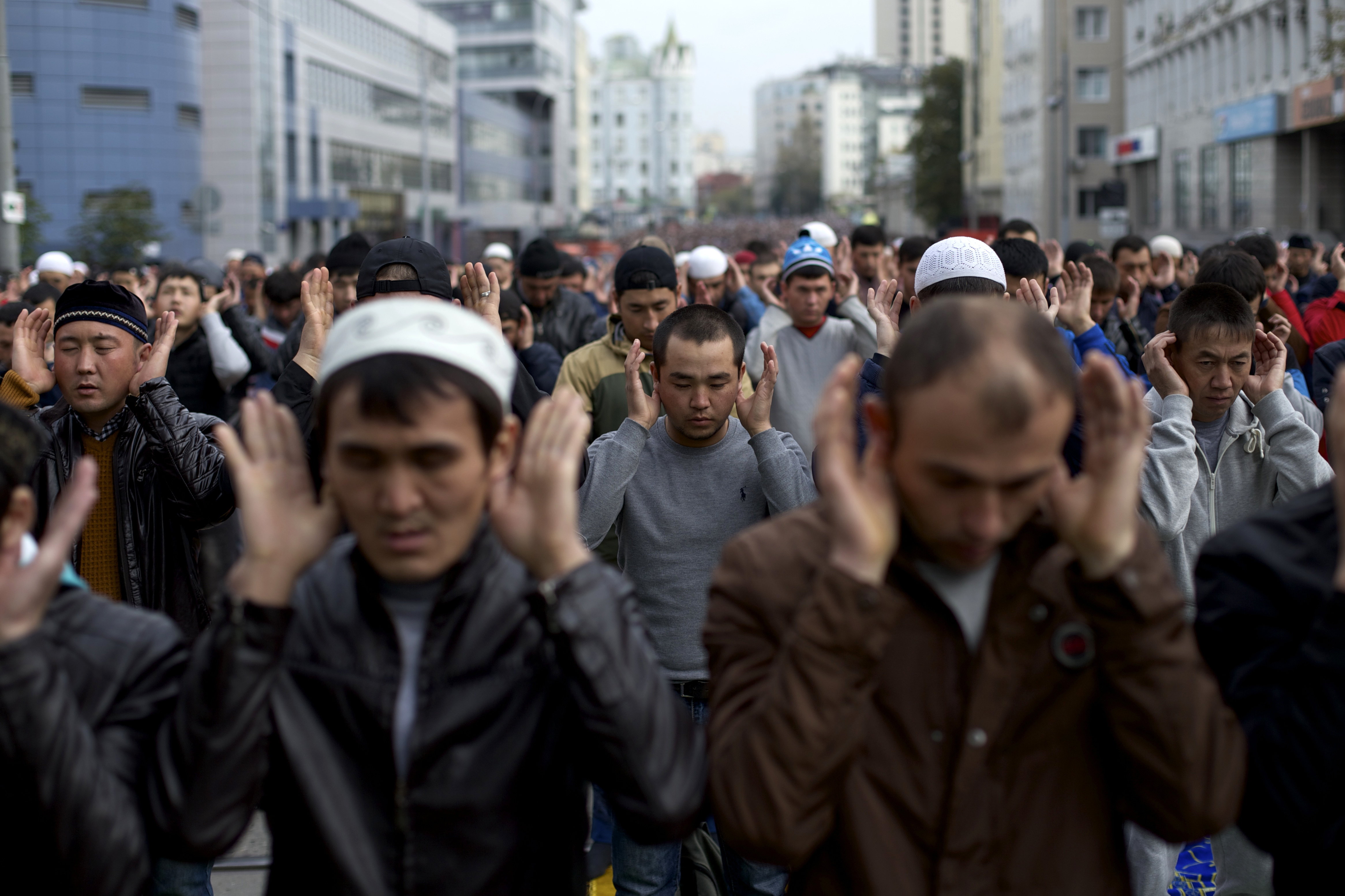 Muslims pray outside a mosque during celebrations of Eid al-Adha, a feast celebrated by Muslims worldwide, which Muslims in Russia call Kurban-Bairamin Moscow, Russia, on Monday, Sept. 12, 2016. (AP Photo/Ivan Sekretarev)