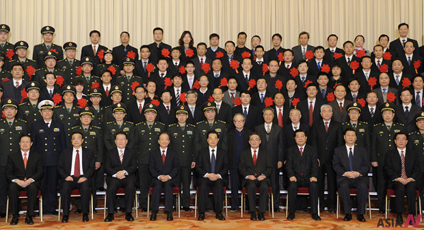 Hu Jintao, Wu Bangguo, Wen Jiabao, Jia Qinglin, Li Changchun, Xi Jinping, Li Keqiang, He Guoqiang and Zhou Yongkang, members of the Standing Committee of the Political Bureau of the Communist Party of China (CPC) Central Committee, pose for a group photo with delegates attending the rally to celebrate the success of China’s first mission of space docking between the target orbiter Tiangong-1 and the Shenzhou-8 spacecraft, in the Great Hall of the People in Beijing, capital of China, Dec. 16, 2011. <Photo: Xinhua/Ma Zhancheng>