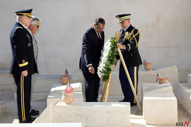 U.S. Defense Secretary Leon Panetta (2nd R) lays a wreath during his visit to the American Cemetery in Tripoli, Libya, on Dec. 17, 2011. U.S. Defense Secretary Leon Panetta arrived in the Libyan capital of Tripoli on Saturday for a brief visit of the North African country which has embarked on a road to reconstruction after a months-old civil war. <Photo: Xinhua/Hamza Turkia>