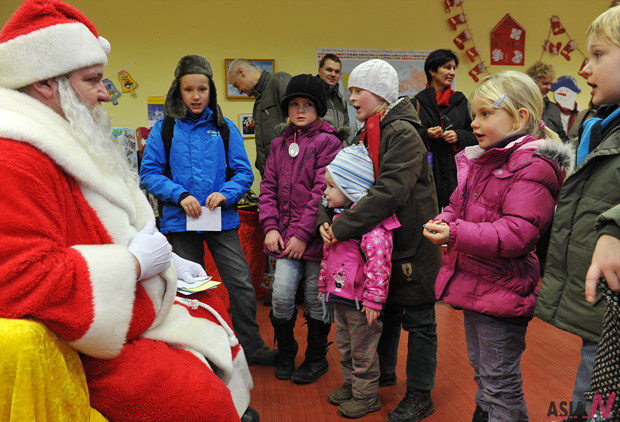 A man dressed as Santa Claus sing Christmas songs with visiting children at a Christmas post office in the village of Himmelpfort (Heaven’s Gate) in Brandenburg, Germany, Dec. 17, 2011.