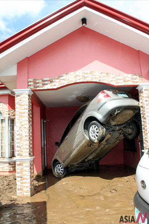 A car is stuck in an entrance hall of a house after the tropical storm Washi hit the place in Cagayan de Oro, Mindanao Island in southern Philippines, Dec. 18, 2011.