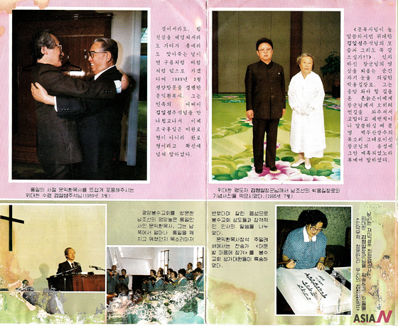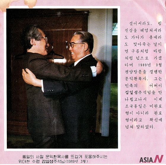 The top left photo of the leaflet is the scene of Moon Ik-hwan and the North Korean founder Kim Il-sung embracing each other.