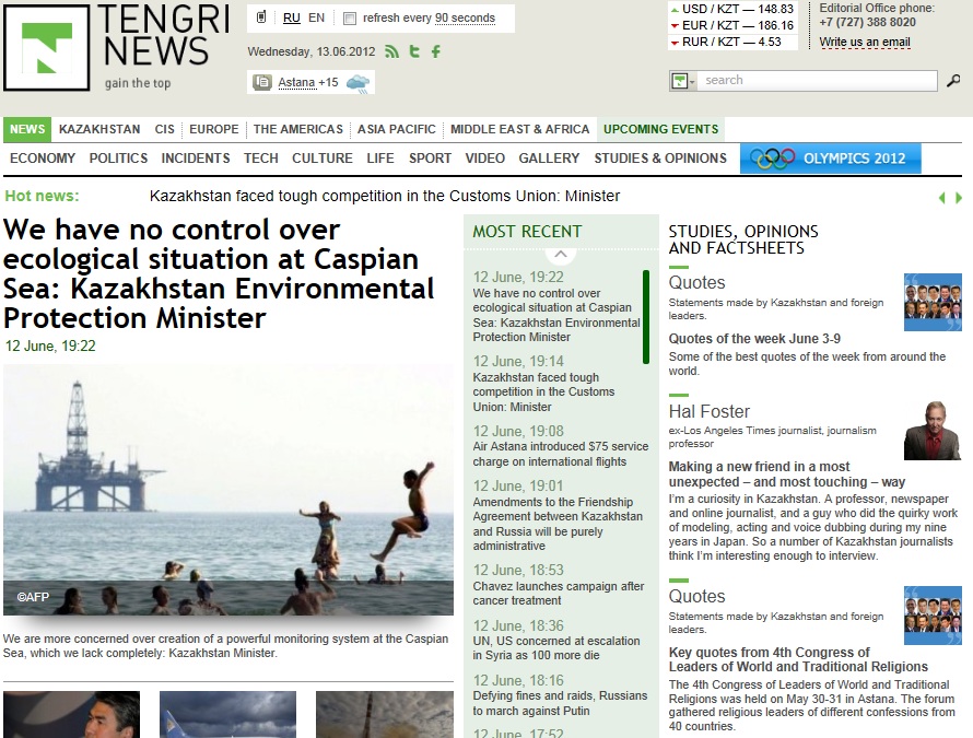 Major news in Kazakhstan on Jun 13 : We have no control over ecological situation at Caspian Sea