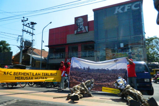 Two activists wearing Sumatran tiger costumes along with several members of Greenpeace visited a KFC fast food restaurant on Jl. Pandanaran, Semarang, Central Java on Saturday, calling on KFC to stop using food-wrapping paper produced by a company allegedly responsible for deforestation in Indonesia.
