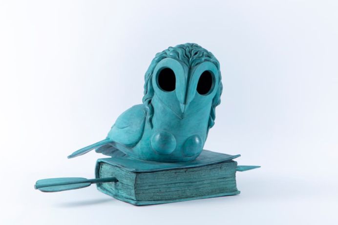 One of his most remarkable works is a sculpture inspired by the tales of One Thousand and One Nights. In it, a metal owl sits on a book, and the feather of Shahrzad is placed within the first fatal arrow—symbolizing the transfer of life and destiny from one being to another.