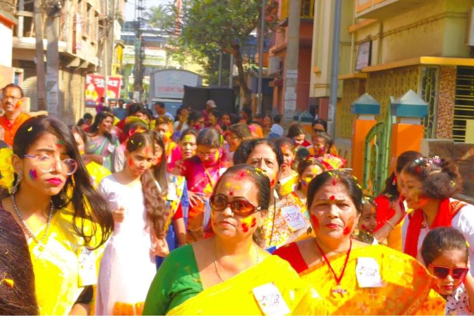 The celebration saw enthusiastic participation from brides, young girls, and people of all ages. Many women wore yellow and other spring-coloured sarees adorned with flowers, adding elegance and warmth to the festive atmosphere. Their presence brought a special charm to the celebration and reflected the deep cultural pride associated with the occasion.