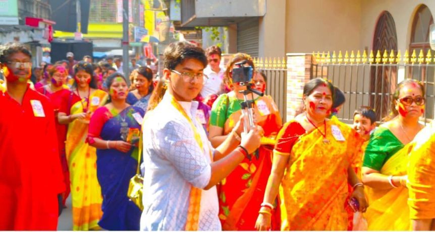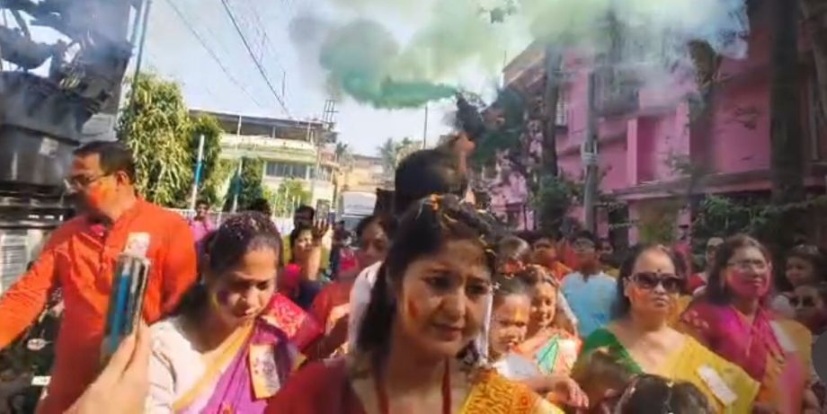 Morning processions began from temple premises, featuring melodious spring songs, traditional dance performances, and the rhythmic beats of the dhak, a traditional drum. Clouds of abir—bright coloured powder—filled the air, creating a breathtaking spectacle that captivated local residents.