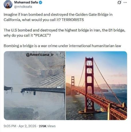 His writing could be understood as follows: by destroying Iran’s infrastructure, we will destroy the infrastructure related to the interests of the United States in the region and its allies, and the oil and gas export facilities in the Persian Gulf will be destroyed. This is a threat that Iranian officials had previously announced.But the second reaction, among the sarcastic and threatening responses, was very thoughtful. Mohammad Safa, a senior UN diplomat who resigned a few days ago in protest of this war, wrote on X-Net: “Imagine if Iran bombed and destroyed the Golden Gate Bridge in California, what would you call it? TERRORISTS. The U.S bombed and destroyed the highest bridge in Iran, the B1 bridge, why do you call it ‘PEACE’? Bombing a bridge is a war crime under international humanitarian law.”