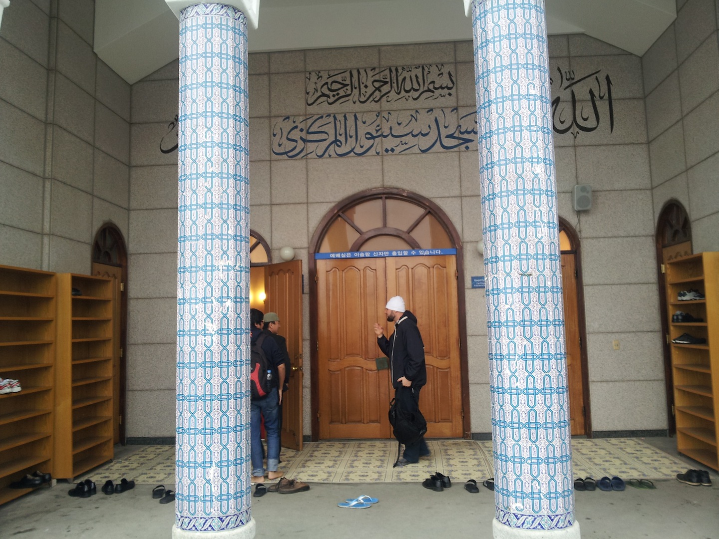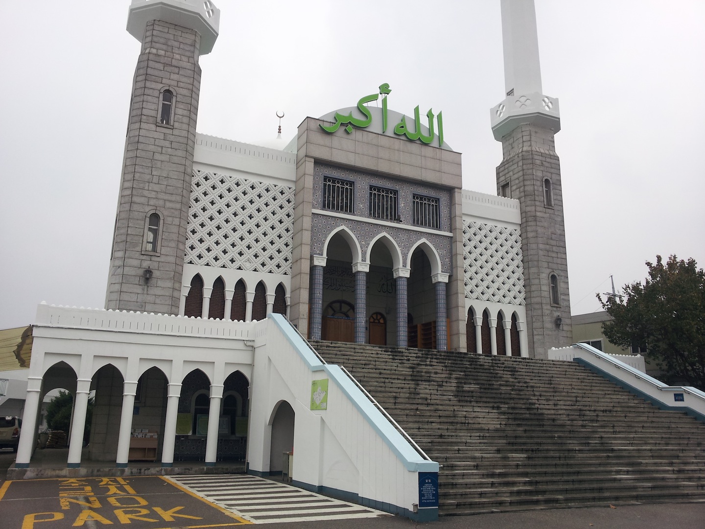 The main gate is tall, built of wall covered with Middle East designed tails, with Korean Hanguel written above the wall, quoting a Koran’s verse saying, “There is no god except Allah and that Muhammad is a messenger of Allah.”