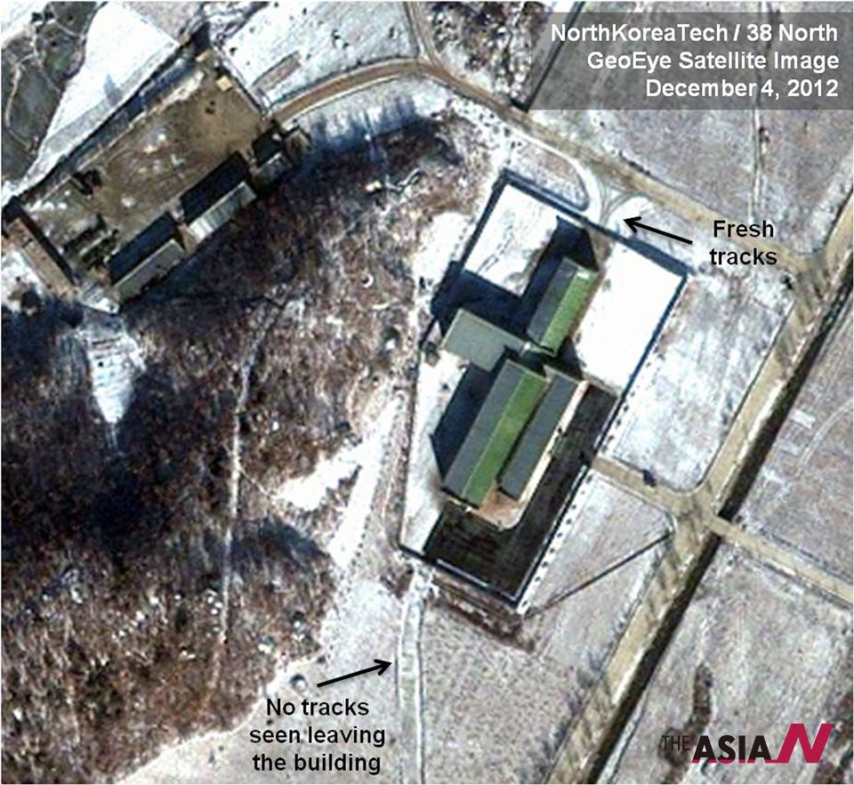 This Dec. 4, 2012 file satellite image taken by GeoEye and annotated and distributed by North Korea Tech and 38 North shows snow covering the Sohae launching station in Tongchang-ri, North Korea, including the path where trailers would be used to move the rocket stages from the assembly building to the launch pad in preparation for a Dec. 10-22 launch. North Korea may postpone the controversial launch of a long-range rocket that had been slated for liftoff as early as Monday, Dec. 10, 2012, North Korean state media said Sunday, Dec. 9, 2012. <AP Photo/GeoEye via North Korea Tech and 38 North, File>