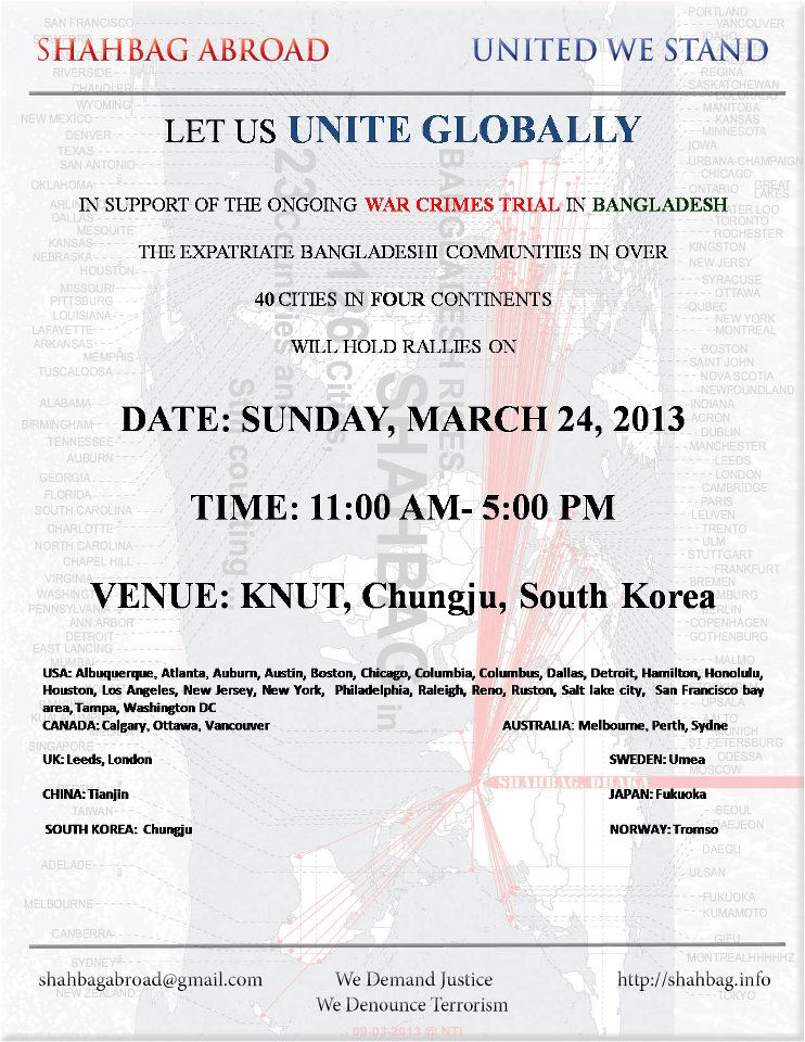 In Chungju, Korea, the Bangladesh community will gather from all over the nation and not only hold a rally for the justice of war crime victims, but will hold a cultural program, a poster exhibition, seminar and sport activities. All Bangladeshi, Korea and other nationalities are invited to join.