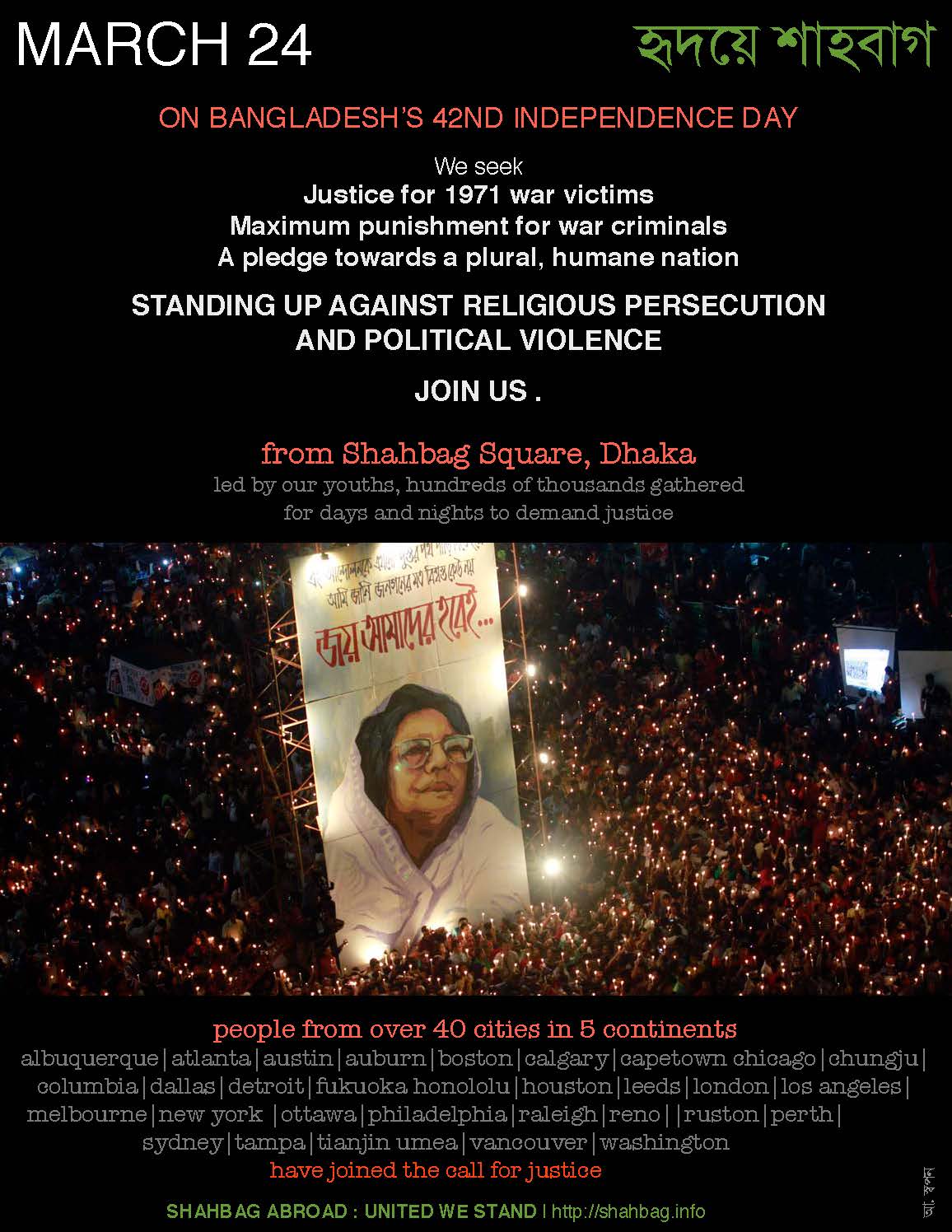In commemoration of the 42nd Anniversary of Bangladesh’s Independence and National Day, the Bangladeshi global community will join together this upcoming March 24th and carry out events in 40 cities in 5 continents including San Francisco, Capetown, London, Sydney and Chungju to pay homage and demand justice for victims of the 1971 Genocide and War Crimes in Bangladesh.