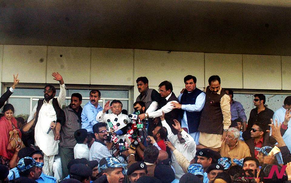 Pakistan’s former president Pervez Musharraf (back-C) addresses supporters outside the airport his arrival from Dubai in southern Pakistani port city of Karachi on March 24, 2013. Musharraf returned home on Sunday after a self-exile for over four years to take part in the May 11 parliamentary elections, his party said.