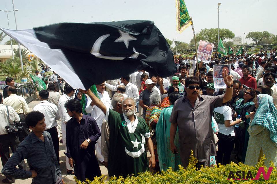Supporters of Pakistan’s former president Pervez Musharraf gather upon his arrival from Dubai in southern Pakistani port city of Karachi on March 24, 2013. <Xinhua/NEWSis/Masroor>