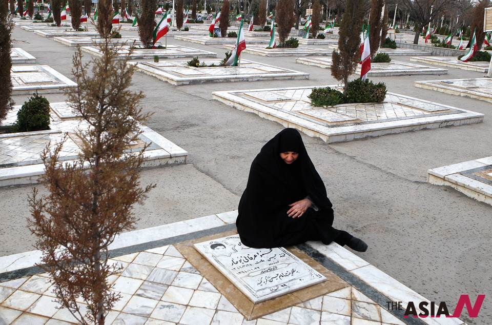 A woman sit at a grave of a soldier who was killed during the 1980-88 Iran-Iraq war, at the Behesht-e Reza cemetery in Mashhad city, northeastern Iran, March 25, 2013. <Xinhua/NEWSis/Ahmad Halabisaz>