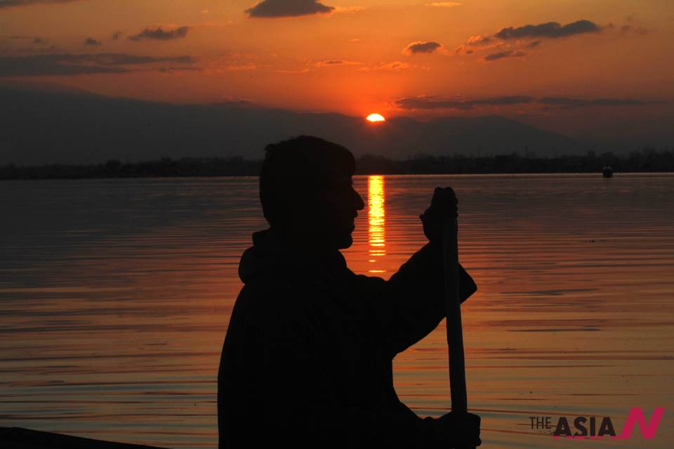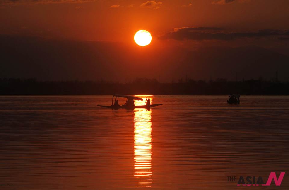 A Kashmiri boatman rows his boat at the Dal Lake during sunset in Srinagar, India, Monday, March, 25, 2013. Set in the Himalayas, Kashmir is a green, saucer-shaped valley full of fruit orchards and surrounded by snowy mountain ranges. About 100 lakes dot its highlands and plains. <AP Photo/NEWSis/Mukhtar Khan>