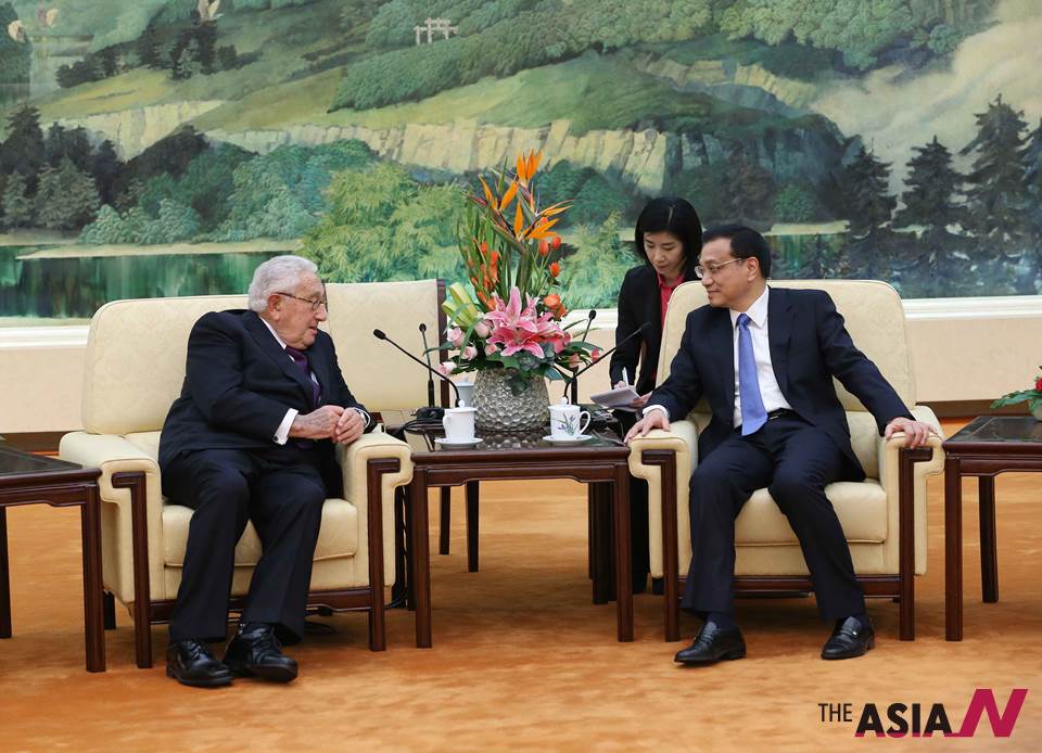 Chinese Premier Li Keqiang (R) meets with former U.S. Secretary of State Henry Kissinger in Beijing, capital of China, March 25, 2013. <Xinhua/NEWSis/Liu Weibing>