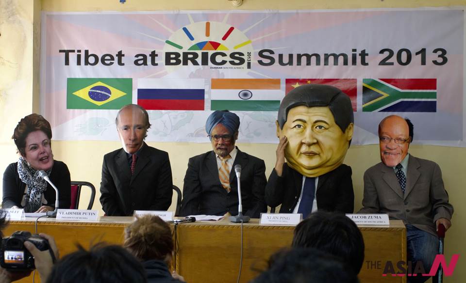 Exiled Tibetans wearing masks of leaders of BRICS nations stage a mock presentation in Dharamsala, India, Monday, March 25, 2013 as they urge the leaders to discuss the Tibetan issue at the BRICS summit beginning March 26 in Durban. The masks, from left, represent Brazilian President Dilma Rousseff, Russian President Vladimir Putin, Indian Prime Minister Manmohan Singh, Chinese President Xi Jinping and South African President Jacob Zuma.