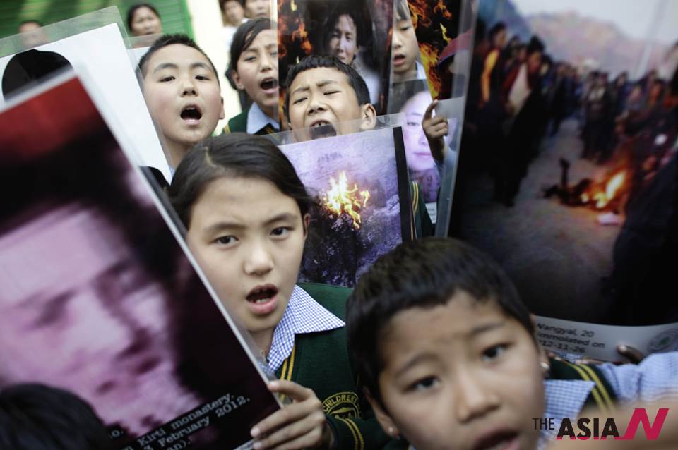 Tibetan schoolchildren shout slogans during a protest rally against the Chinese government, in Dharmsala, India, Monday, March 25, 2013. The Tibetan exiles were protesting against Chinese policies, which they say are forcing people to immolate themselves. A U.S.-backed broadcaster said a Tibetan mother of four young children has killed herself Sunday in the latest self-immolation protest in western China. <AP Photo/NEWSis/Tsering Topgyal>