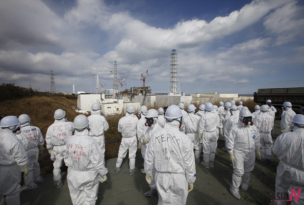 Members of the media wearing protective suits and masks inspect as they are escorted by TEPCO employees at Tokyo Electric Power Co. (TEPCO)’s tsunami-crippled Fukushima Daiichi nuclear power plant in Fukushima prefecture, Japan, Feb. 20, 2012.