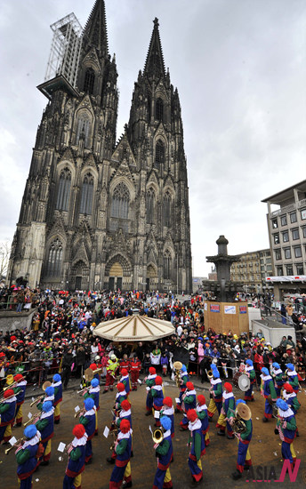 Revelers participate in a parade during the Rosenmontag, a main activity of the Cologne Carnival, Feb. 20, 2012. <Photo: Xinhua/Ma Ning>
