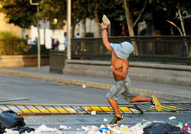 A protestor throws a stone at the police during a protest in support of the Aysen community demands, in Santiago, capital of Chile, on Feb. 20, 2012.