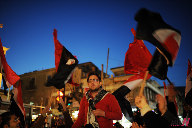 Syrians participate in a rally to protest against the article No.3 of the new draft constitution stating that the president of the country should be Muslim, in Damascus, Syria, Feb. 21, 2012. <Photo: Xinhua/Qin Haishi>
