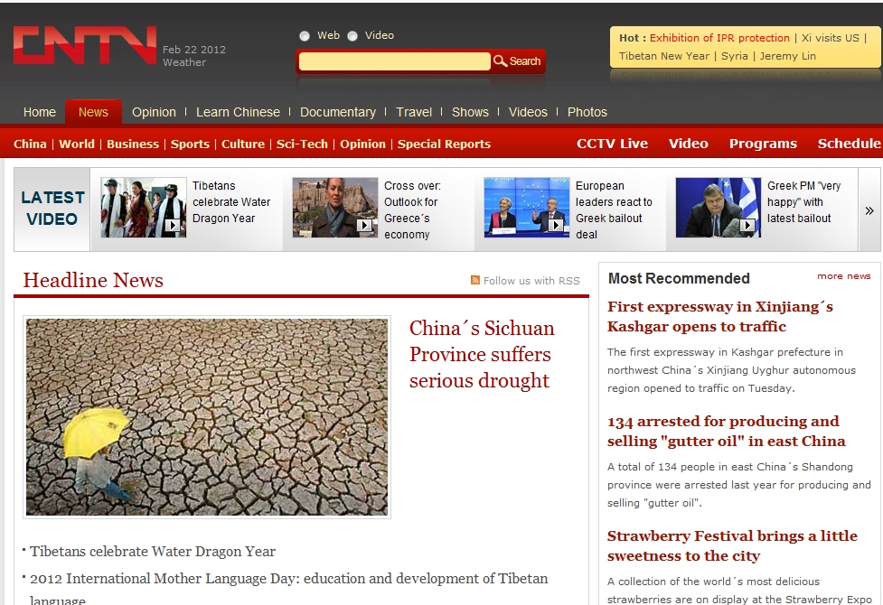 China on 22 February 2012 <CNTV>: China’s Sichuan Province suffers serious drought