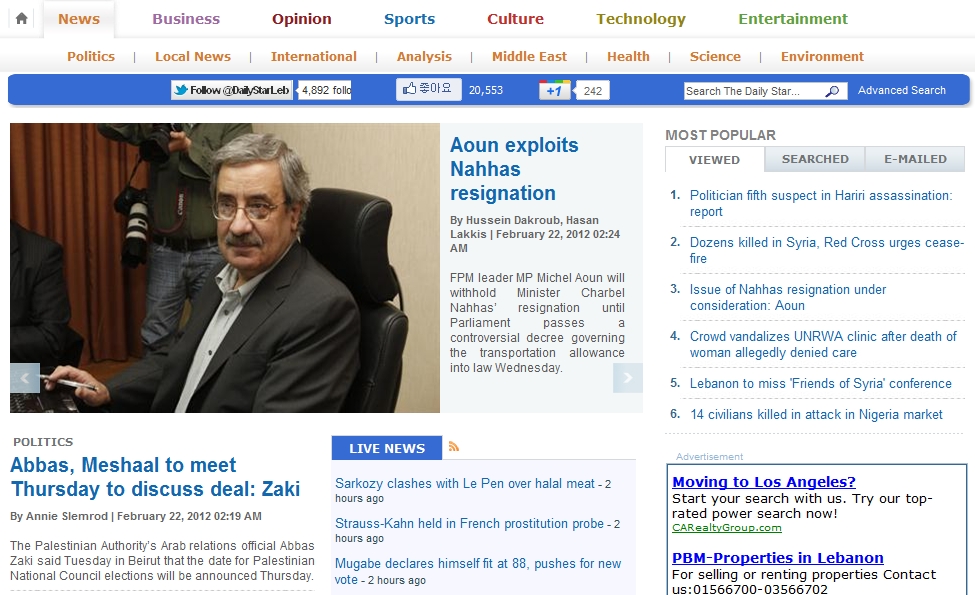 Lebanon on 22 February 2012 <Daily Star>: Abbas, Meshaal to meet Thursday to discuss deal: Zaki